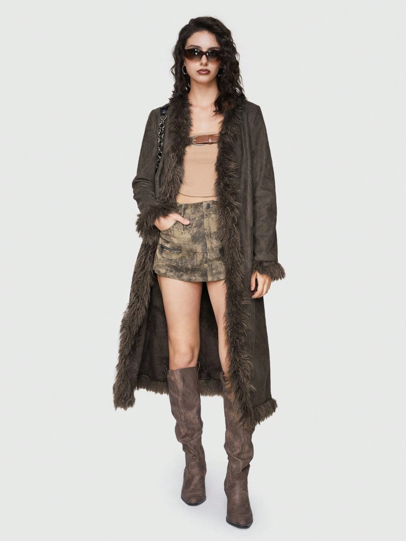 Grunge Punk Manteau long vintage Maillard avec doublure thermique et bordure avec pour femmes