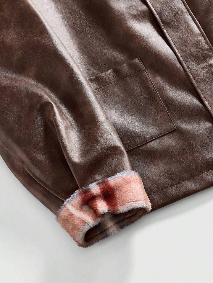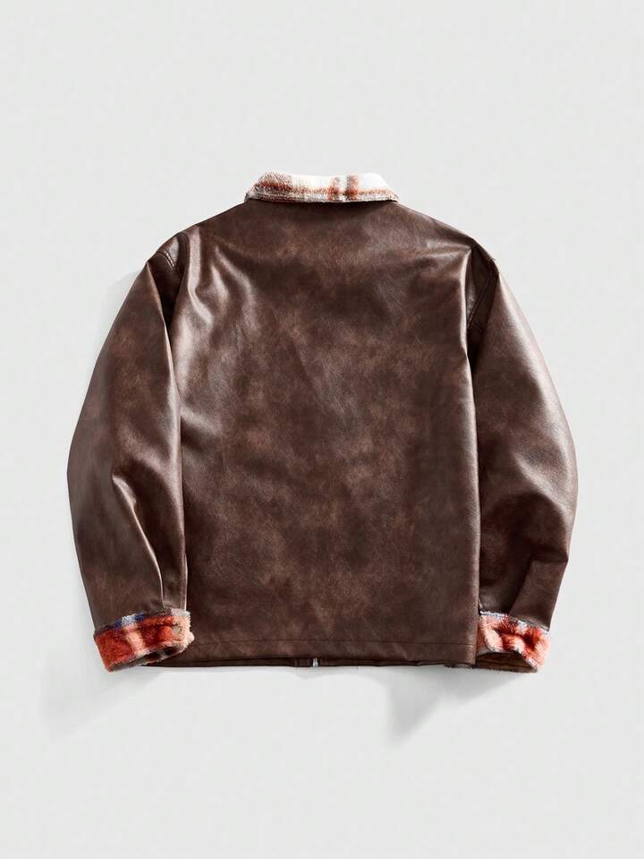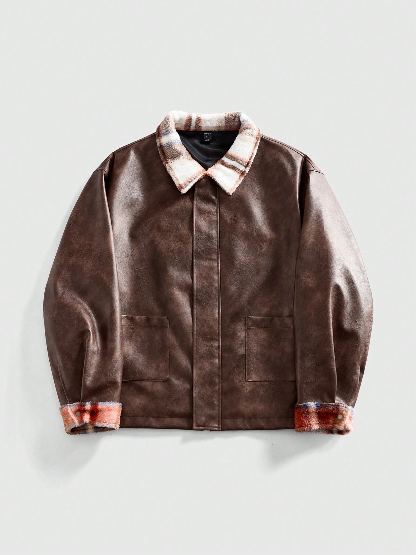Grunge Punk Veste ample en PU à manches longues avec col à carreaux patchwork, style grunge pour hommes en automne