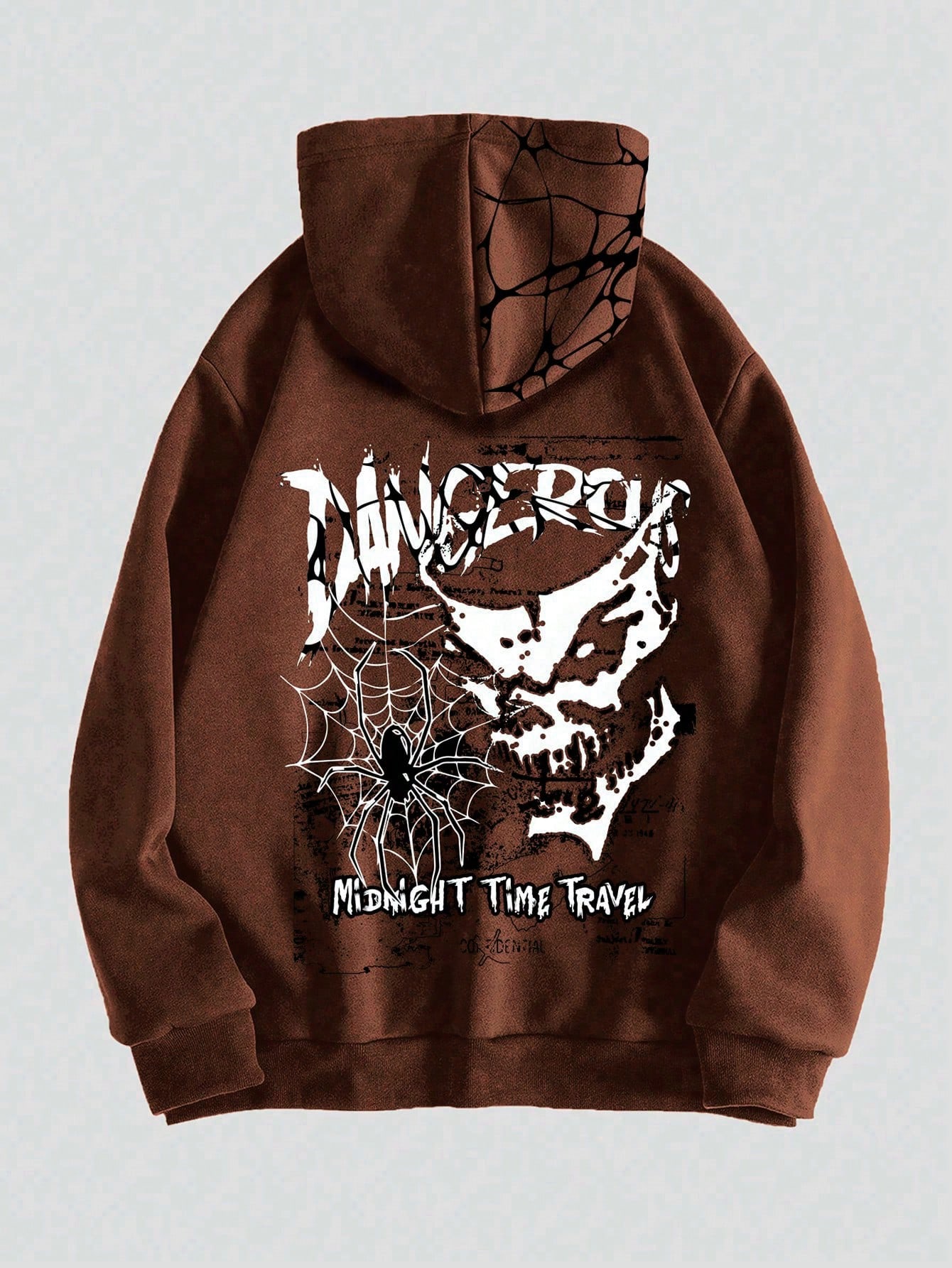 Grunge Punk sweat-shirt à capuche zippé marron avec imprimé d'emblème et de toile d'araignée pour homme, automne/hiver