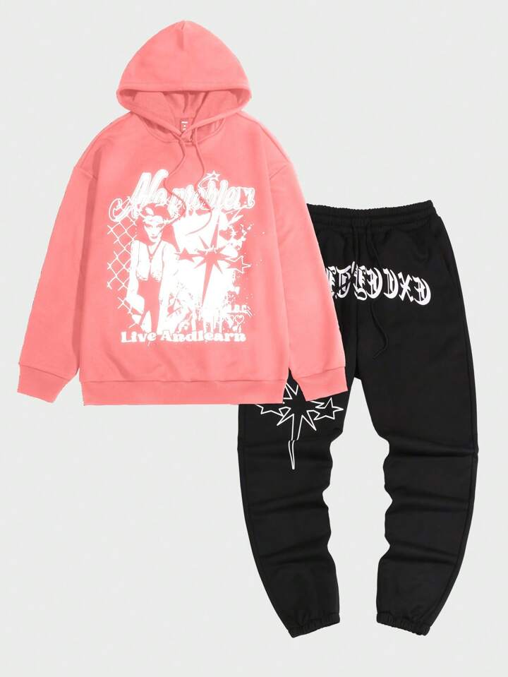 Grunge Punk Ensemble De Sweat-shirt À Capuche Et De Pantalon De Survêtement Pour Homme Avec Cordon De Serrage, Imprimé De Caractères Et De Lettres