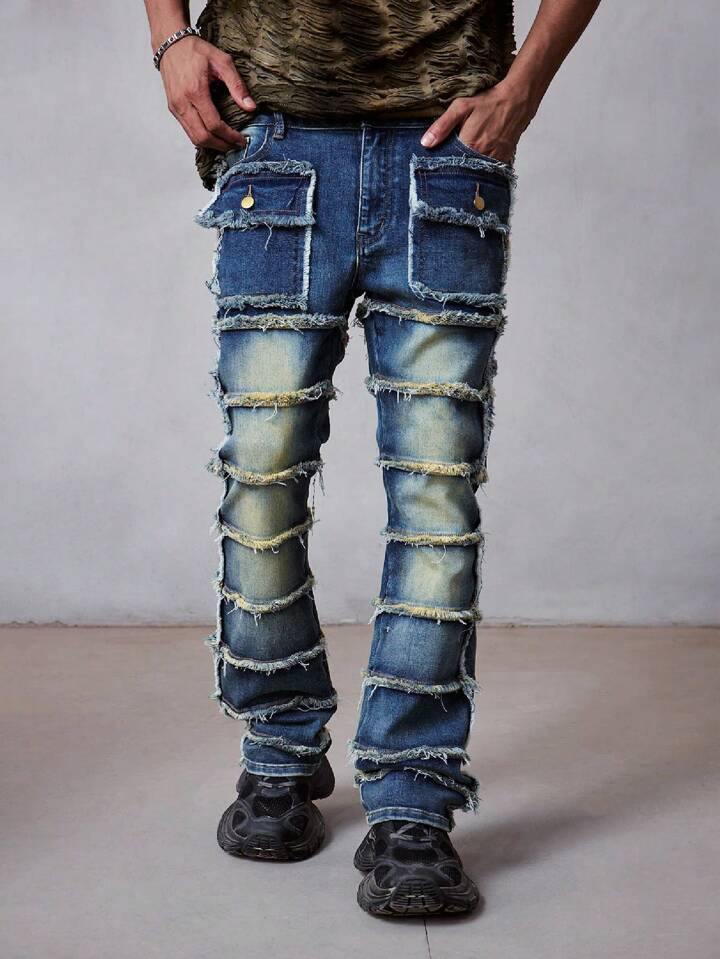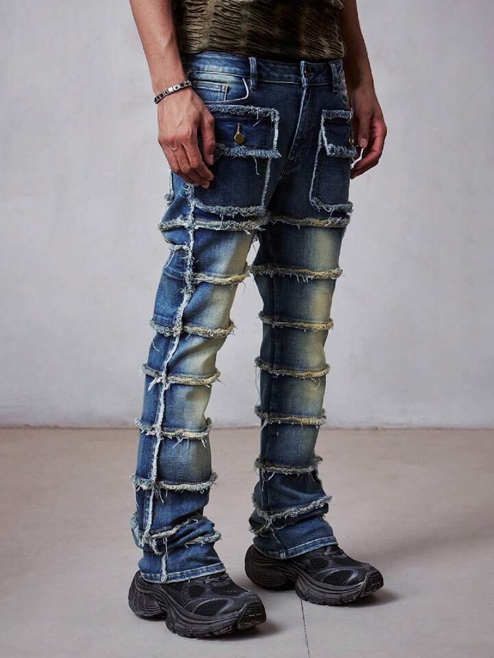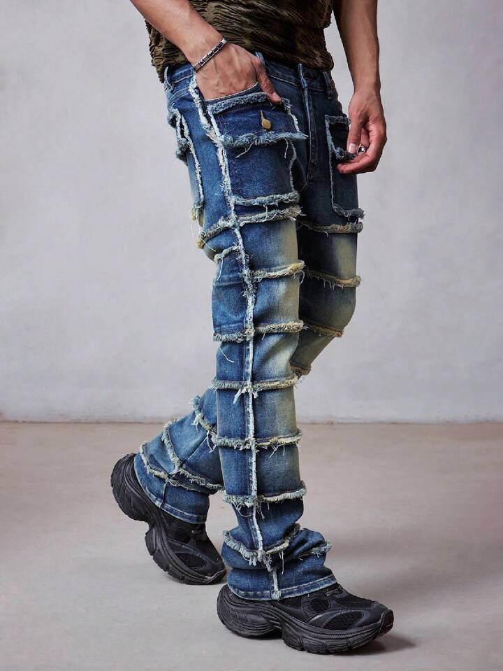 Grunge Punk Jeans déchirés à ourlet superposé et évasé pour hommes