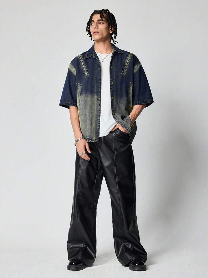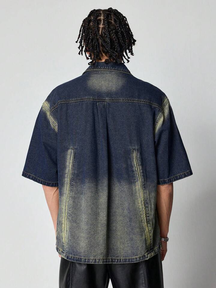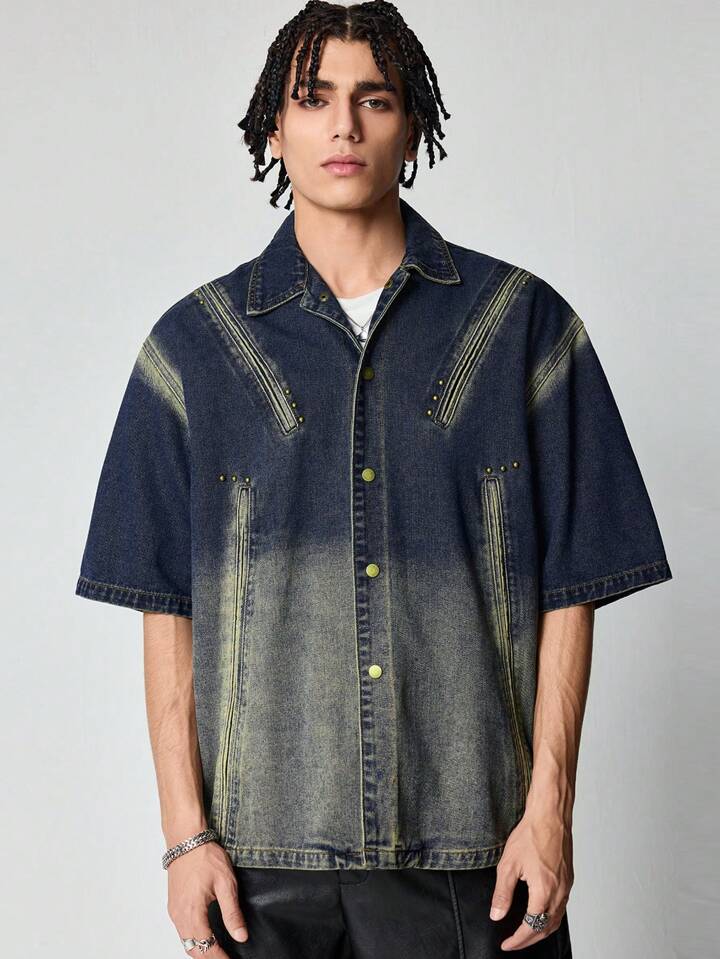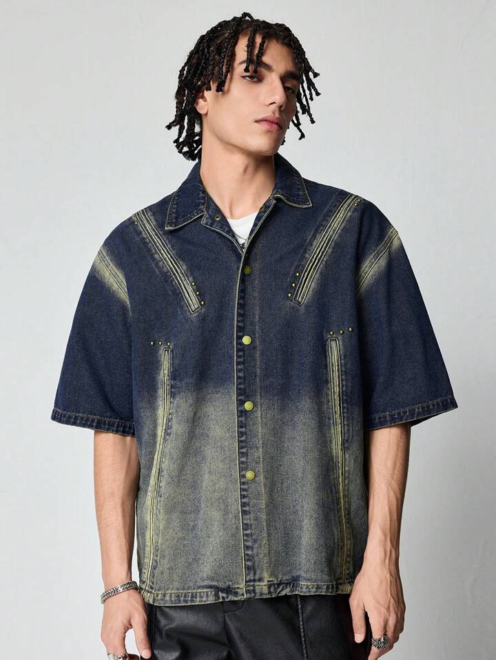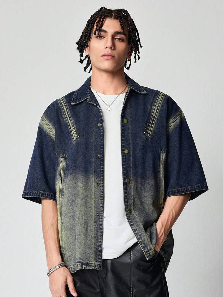 Grunge Punk Veste en jean décontractée, coupe ample, boutonnage simple, manches courtes pour homme