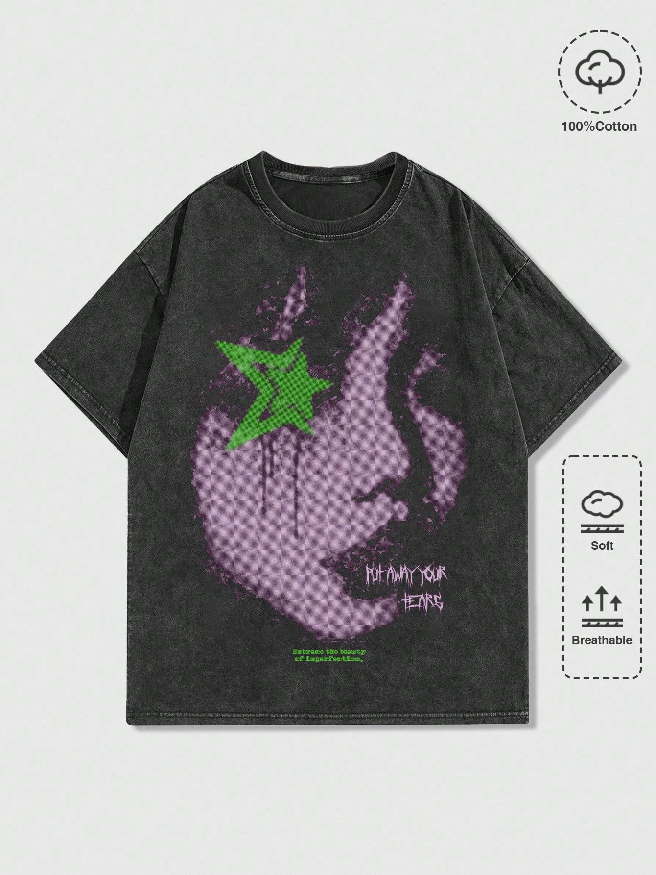 Grunge Punk T-shirt à manches courtes avec portrait d'homme et effet lavé acide, convient pour le port quotidien au printemps/été, style années 2000