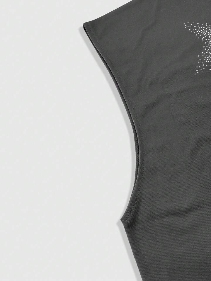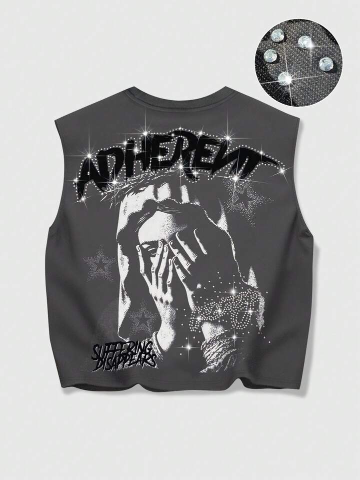 Grunge Punk Débardeur ample style punk de rue mode d'été pour hommes, imprimé lettres Vierge Marie avec ornements de strass