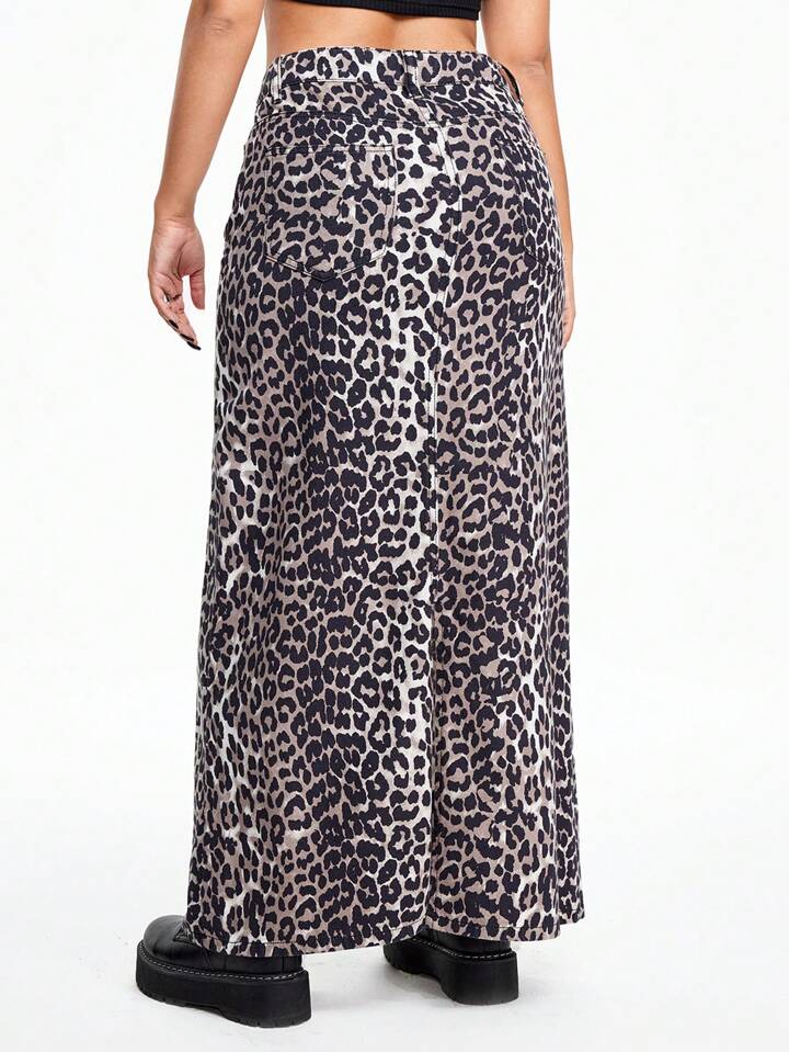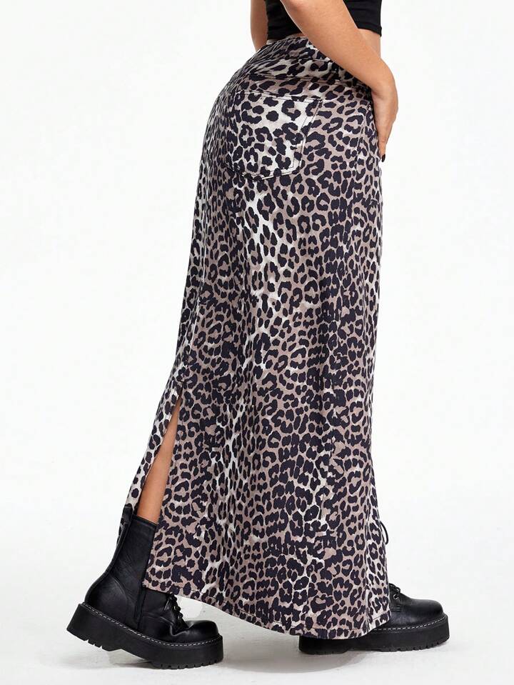 Grunge Punk Jupe mini en jean à fente haute avec imprimé léopard sur le devant et l'arrière, style polyvalent du Millénaire Y2K pour femmes