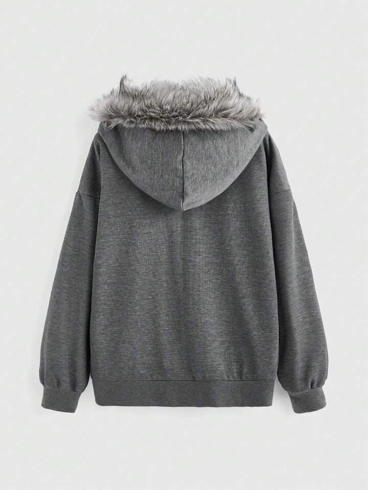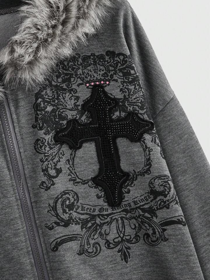 Grunge Punk Veste à capuche ample avec col amovible en fausse fourrure à cristaux, style rock de rue pour festival de musique, pour femmes