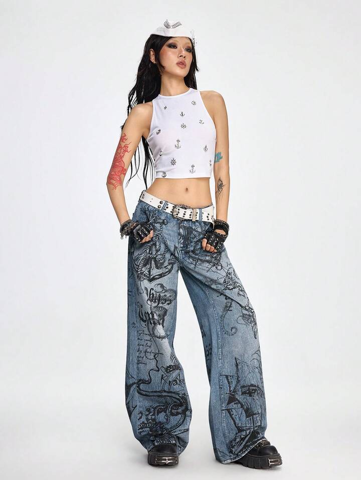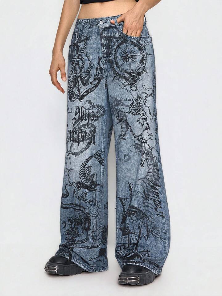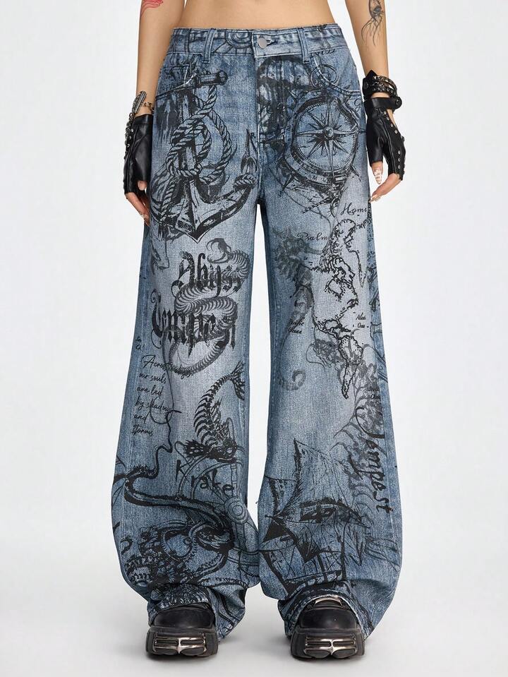 Grunge Punk Jeans amples à jambes larges avec imprimé d'éléments océaniques de style punk marin