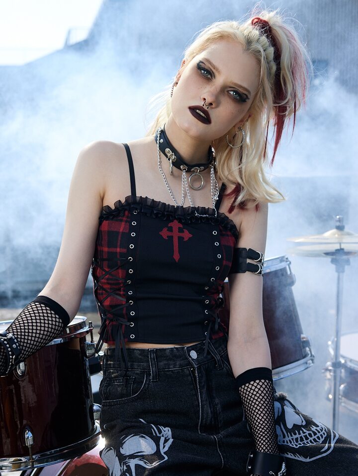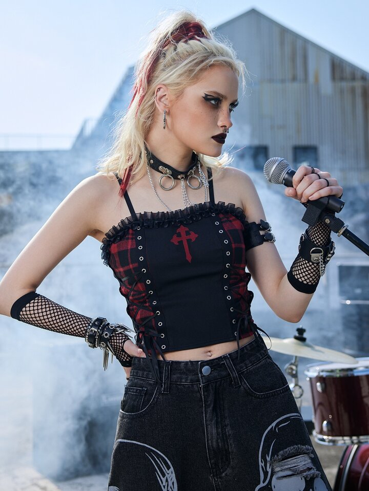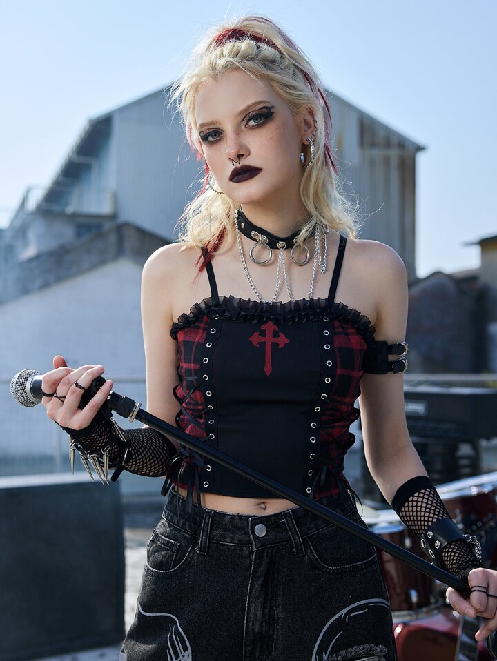 Grunge Punk Top À Fines Brides À Carreaux À Lacets Avec Tulle