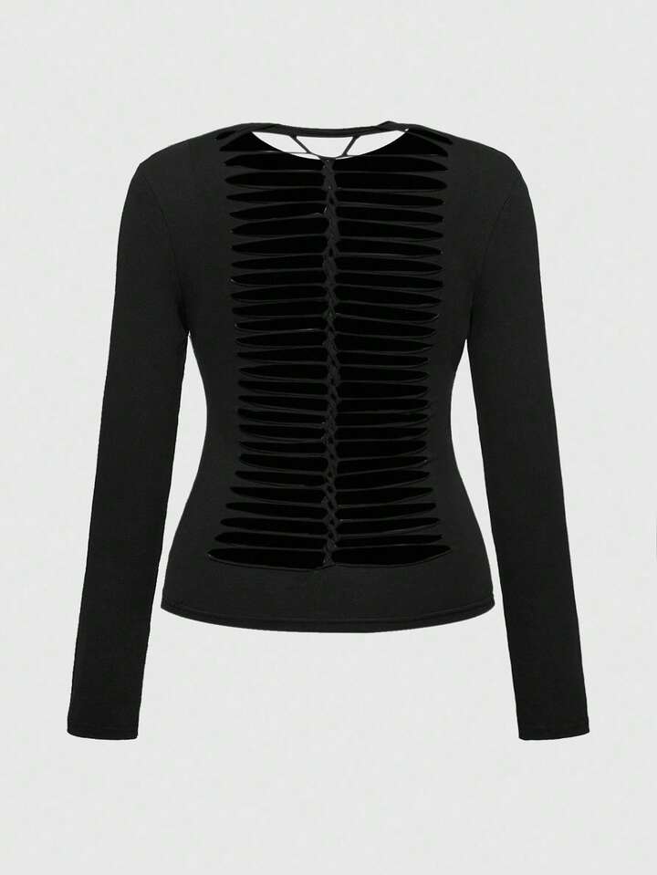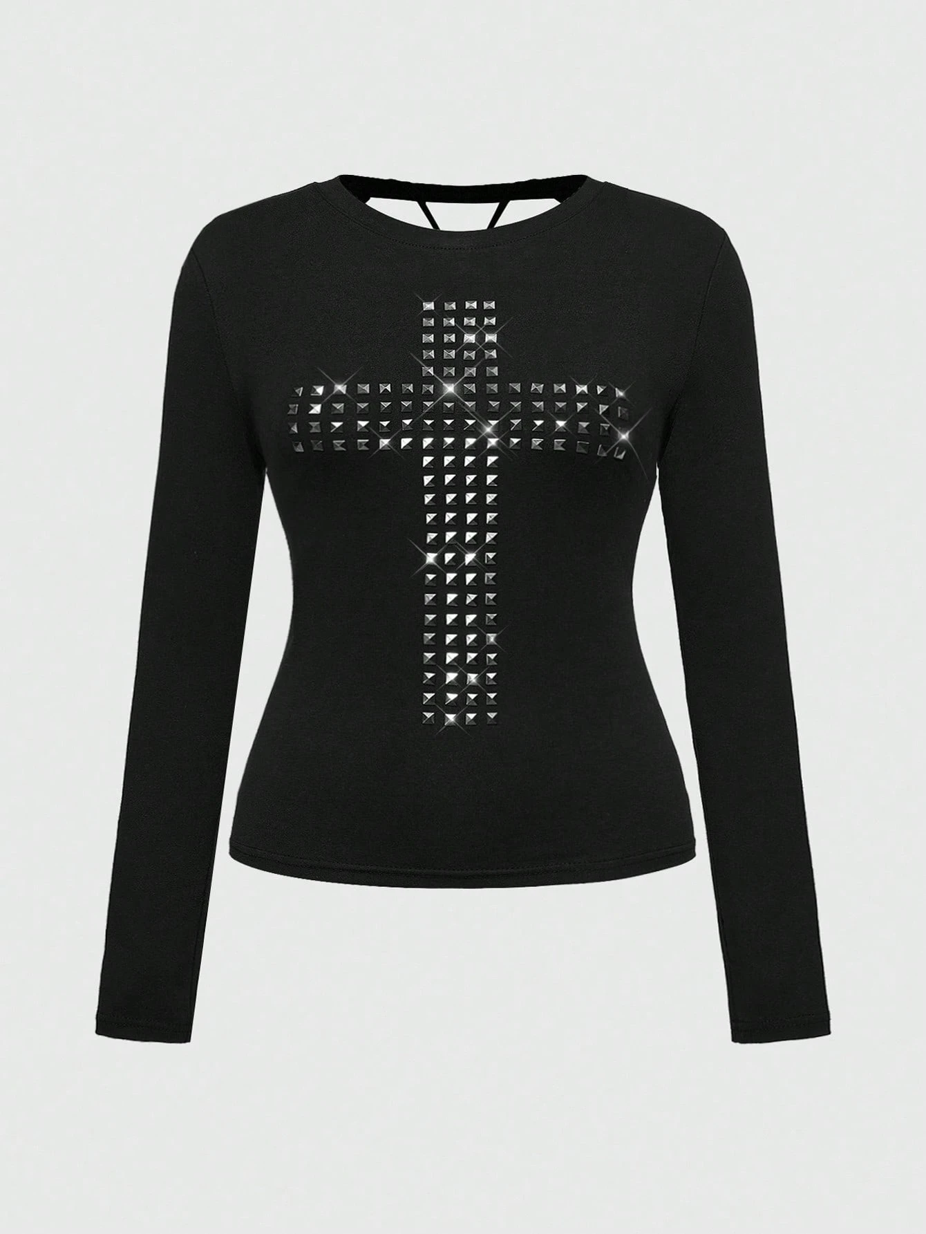 Grunge Punk T-shirt manches longues noir à manches longues avec croix gothique ornée de strass, grande taille. Hauts grande taille pour femmes, blouse gothique casual grande taille pour l'automne/hiver, style Kpop manches longues pour femmes grande taille