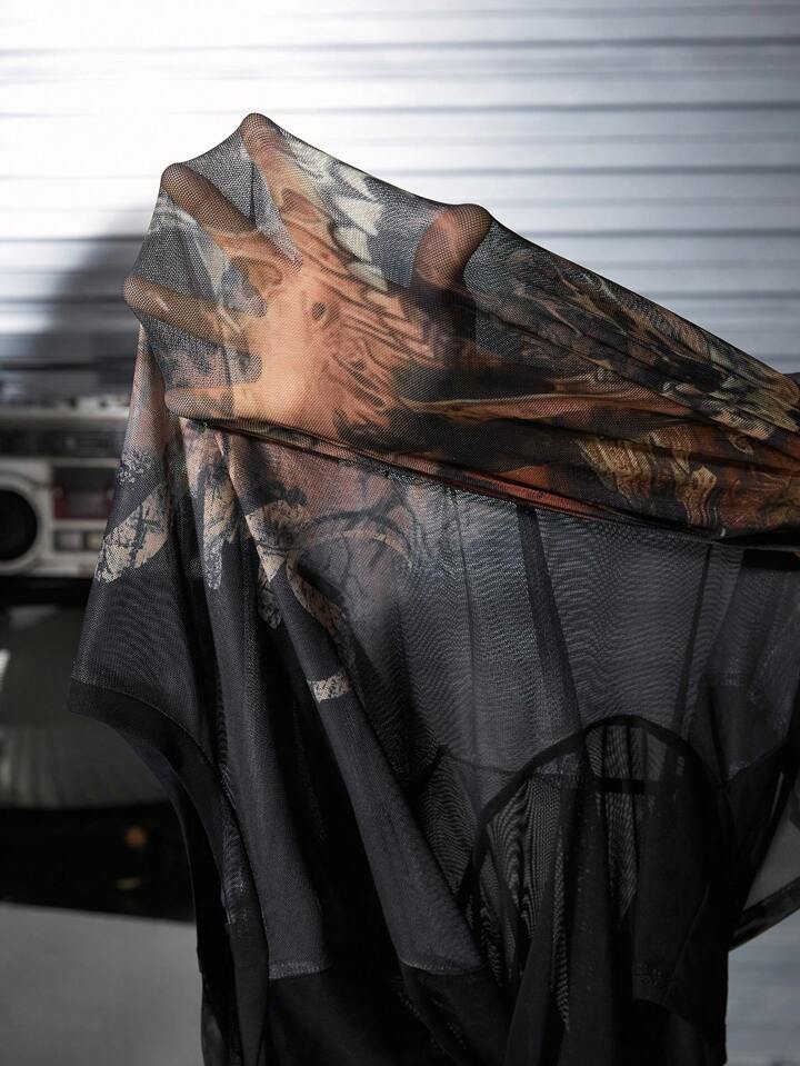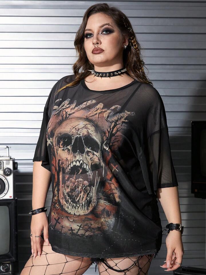 Grunge Punk Chemisier transparent en maille avec imprimé de squelette punk sombre pour femmes grandes tailles