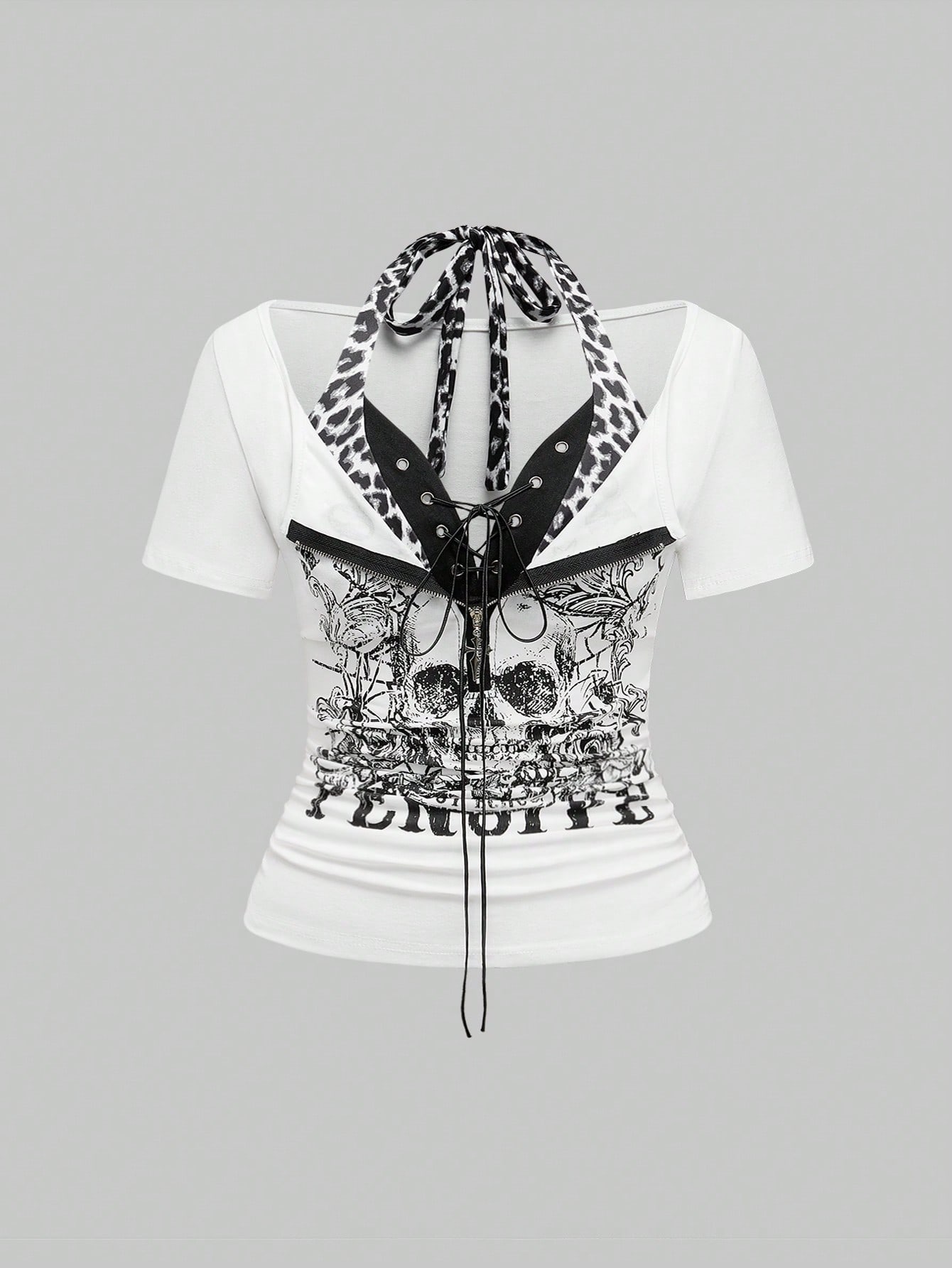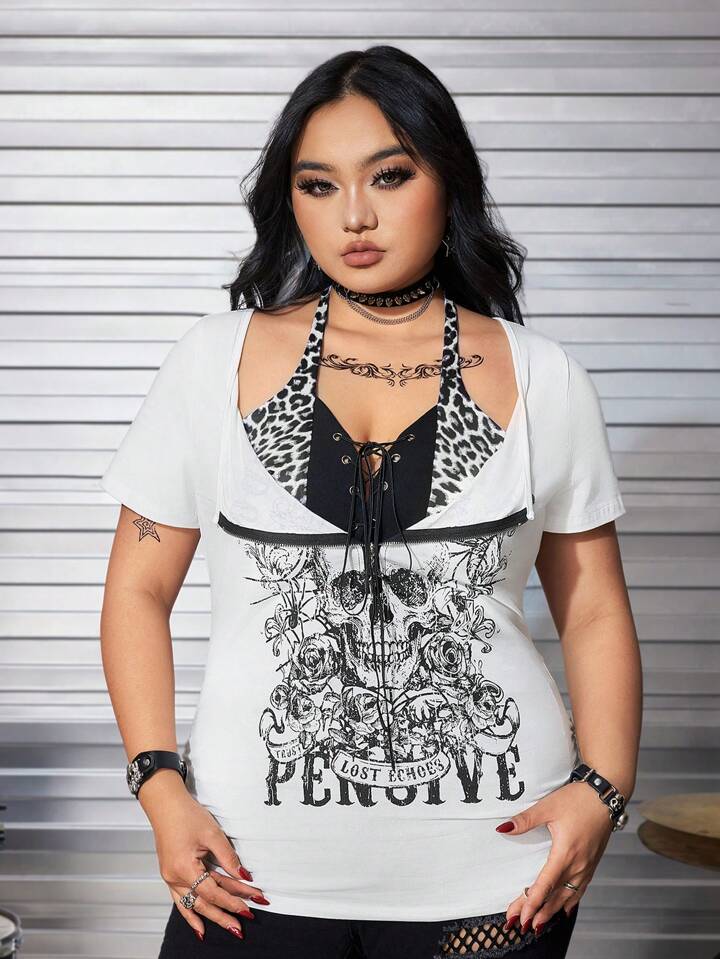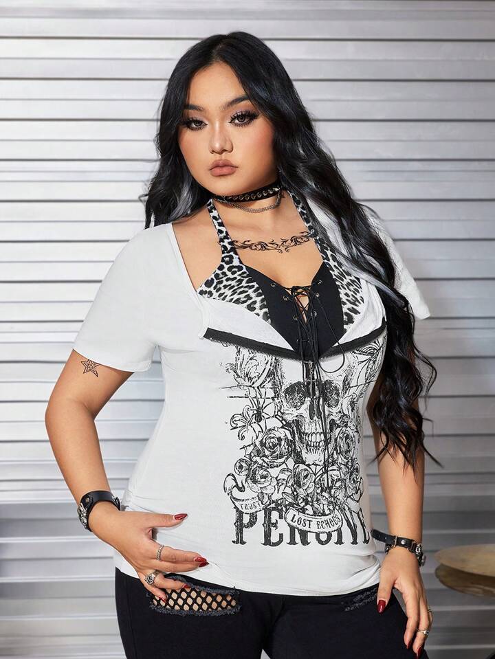 Grunge Punk T-shirt ajusté pour femme grande taille avec imprimé crâne punk et motif patchwork léopard pour l'été