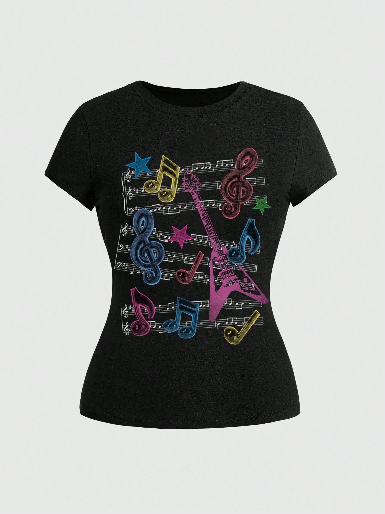 Grunge Punk T-shirt noir ajusté pour femmes grandes tailles, style mode de rue Y2K, avec notes de musique et portée dessinées à la main, pour l'été