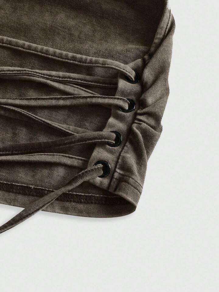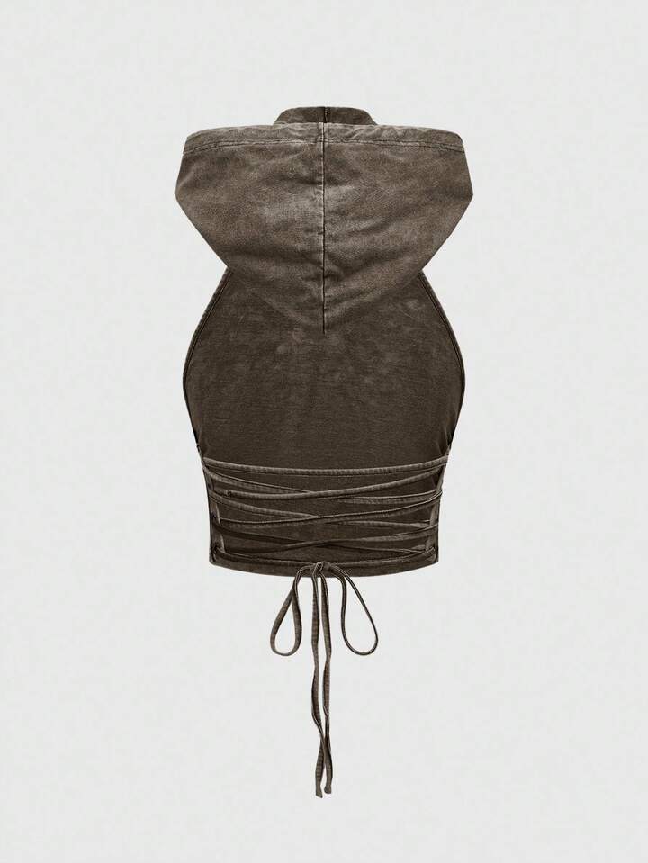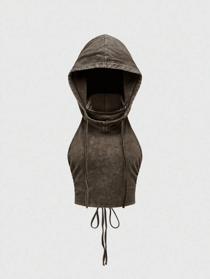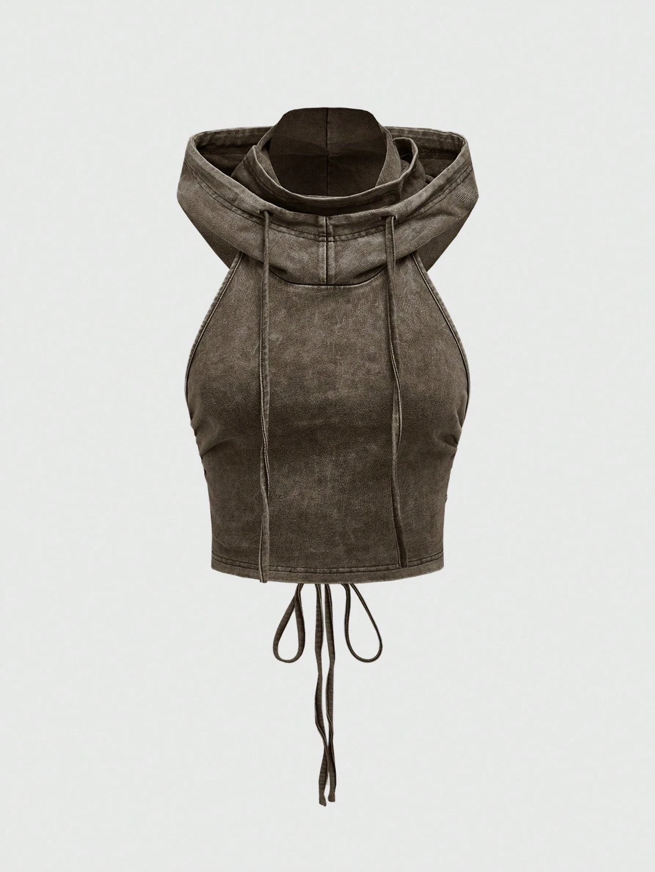Grunge Punk Débardeur court ajusté pour femme avec capuche, dos nu et cordon de serrage, style punk apocalyptique pour festival de musique