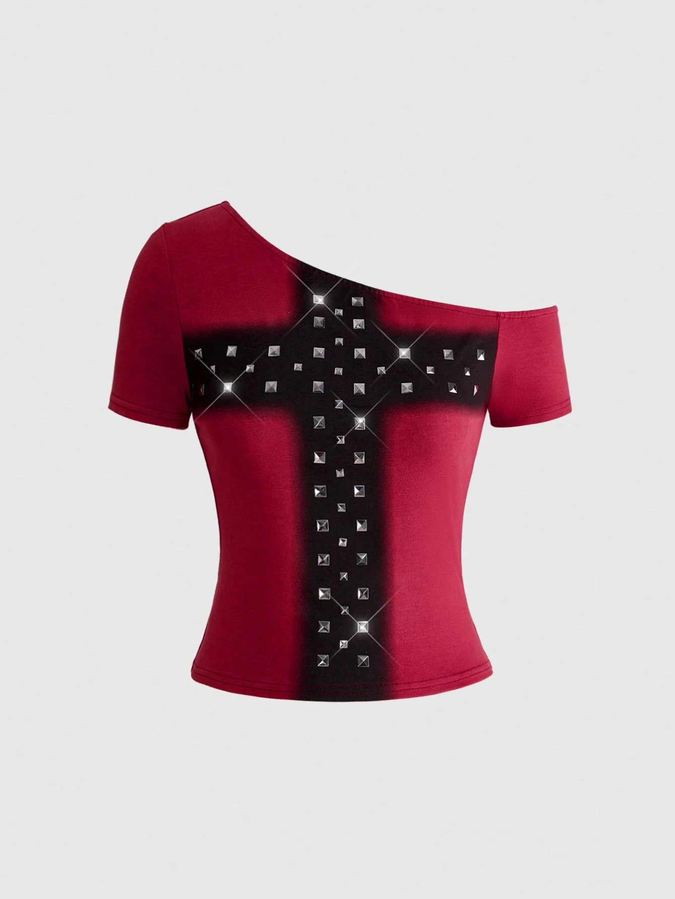 Grunge Punk T-shirt à épaules dénudées avec imprimé croix et rivets métalliques punk
