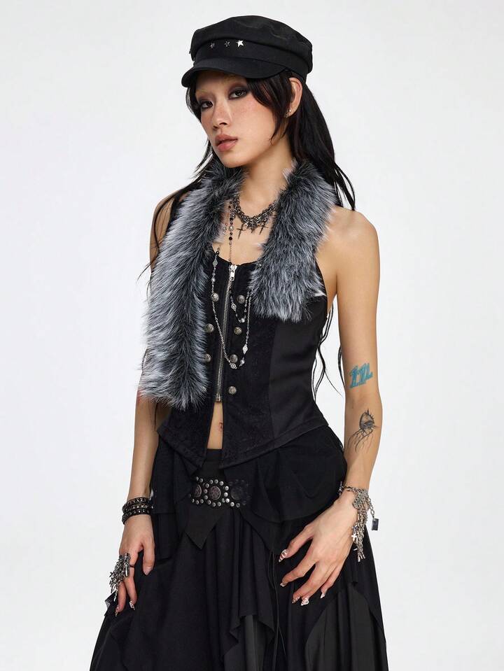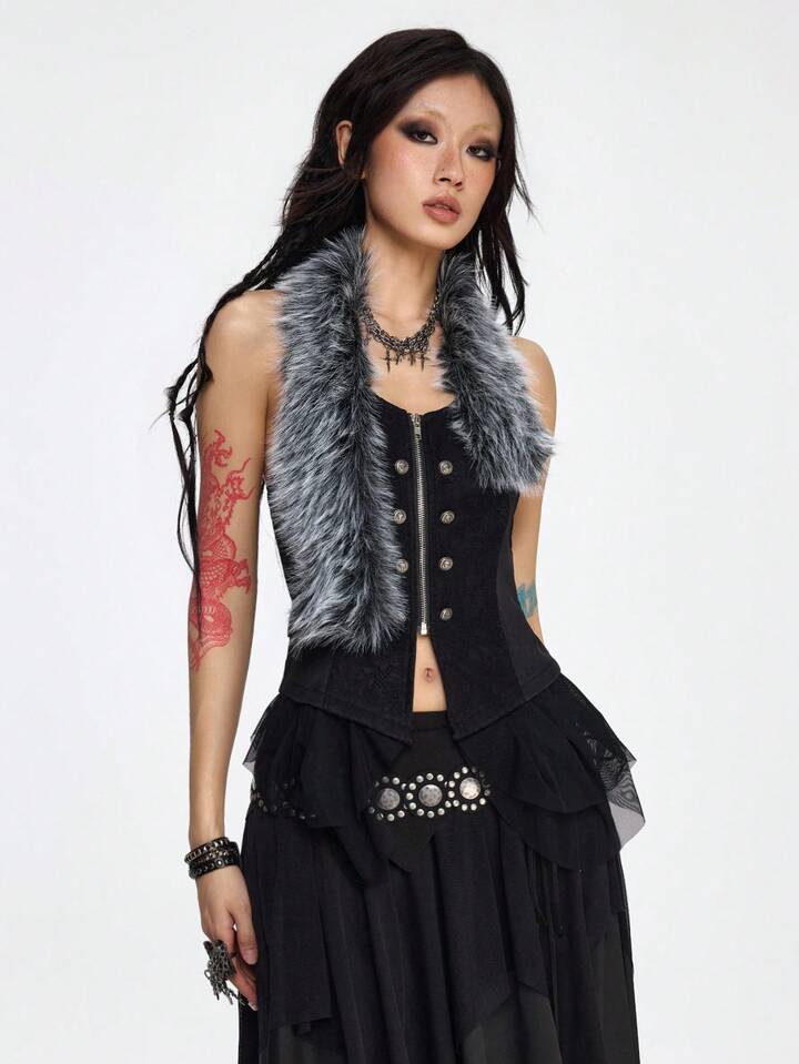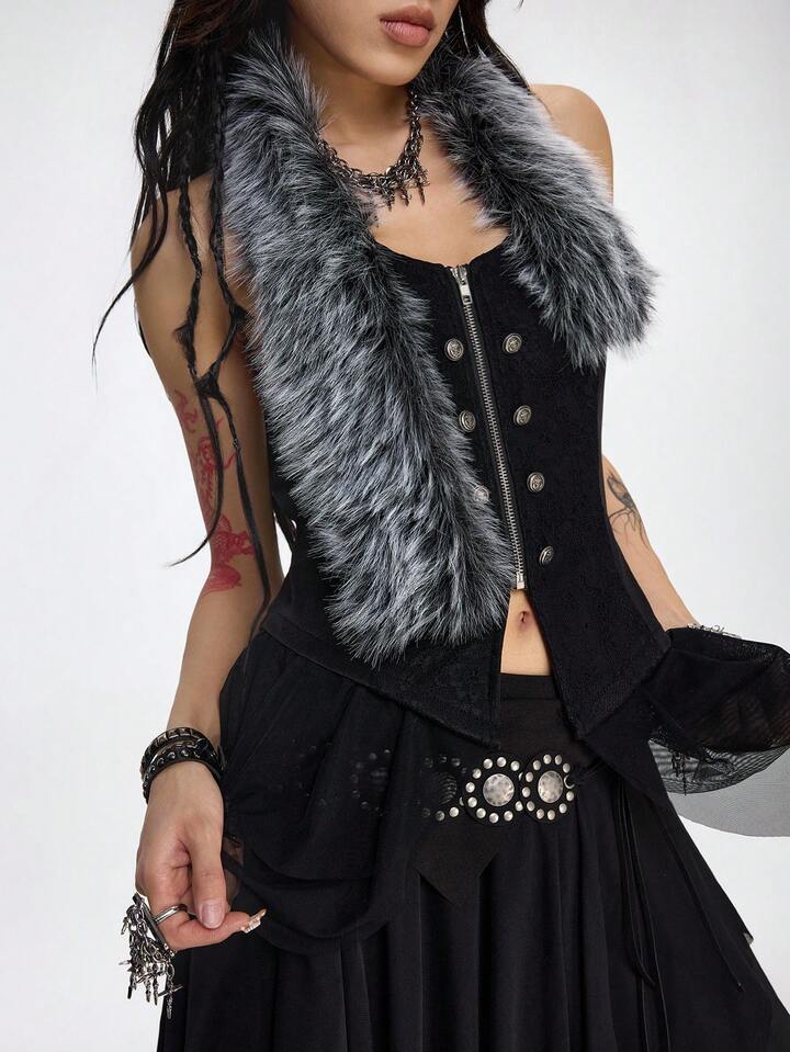 Grunge Punk Top femme à design dos nu, col en fourrure amovible, patchwork de mailles et style nautique punk