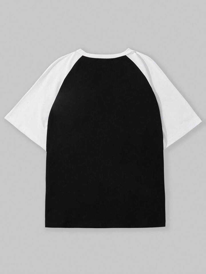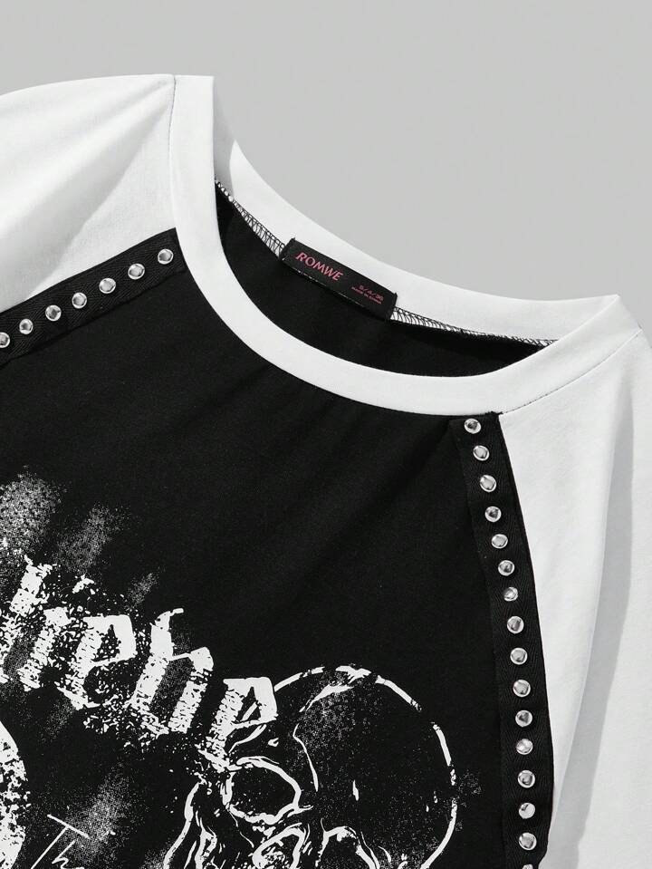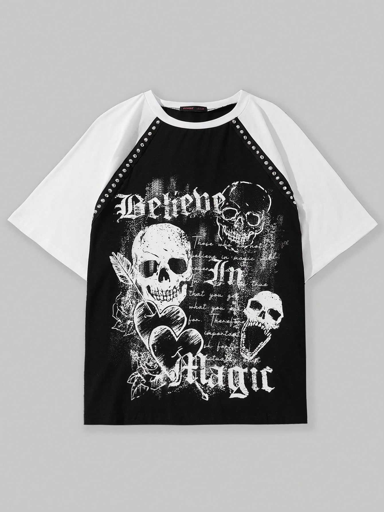 Grunge Punk T-shirt ample femme avec imprimé crâne en peluche patchwork bicolore, détail de rivets, style punk, pour festival de musique