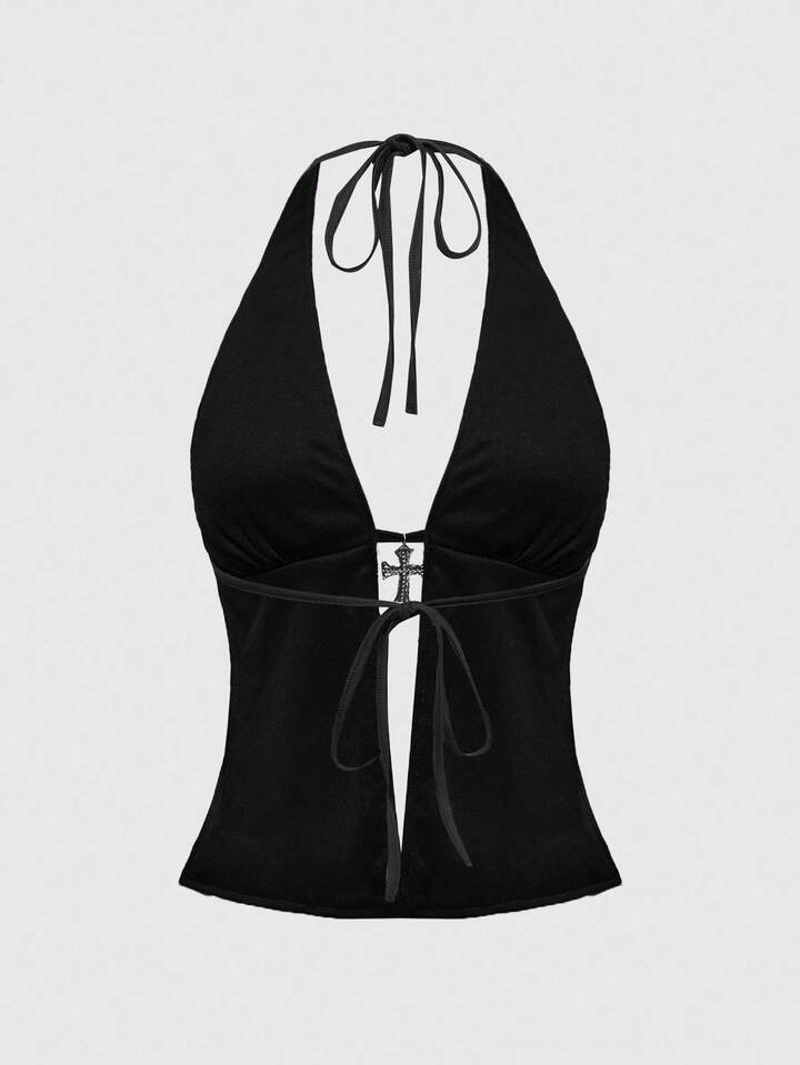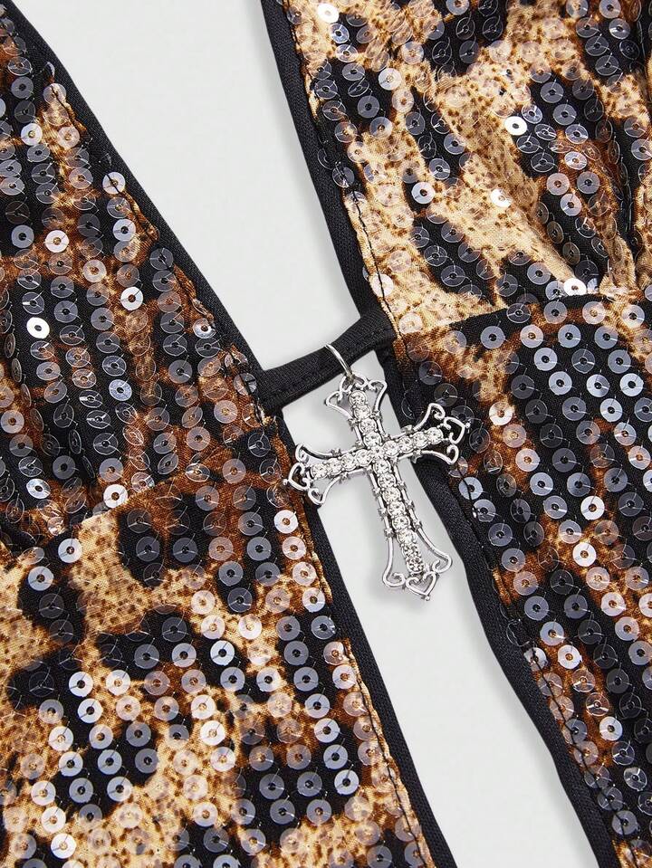 Grunge Punk Tenue de fête de plage chic punk rock, tenue de mode de rue pour événement musical de festival, ensemble femme sexy Y2K Millennium avec pendentif croix à paillettes léopard, style Top-col