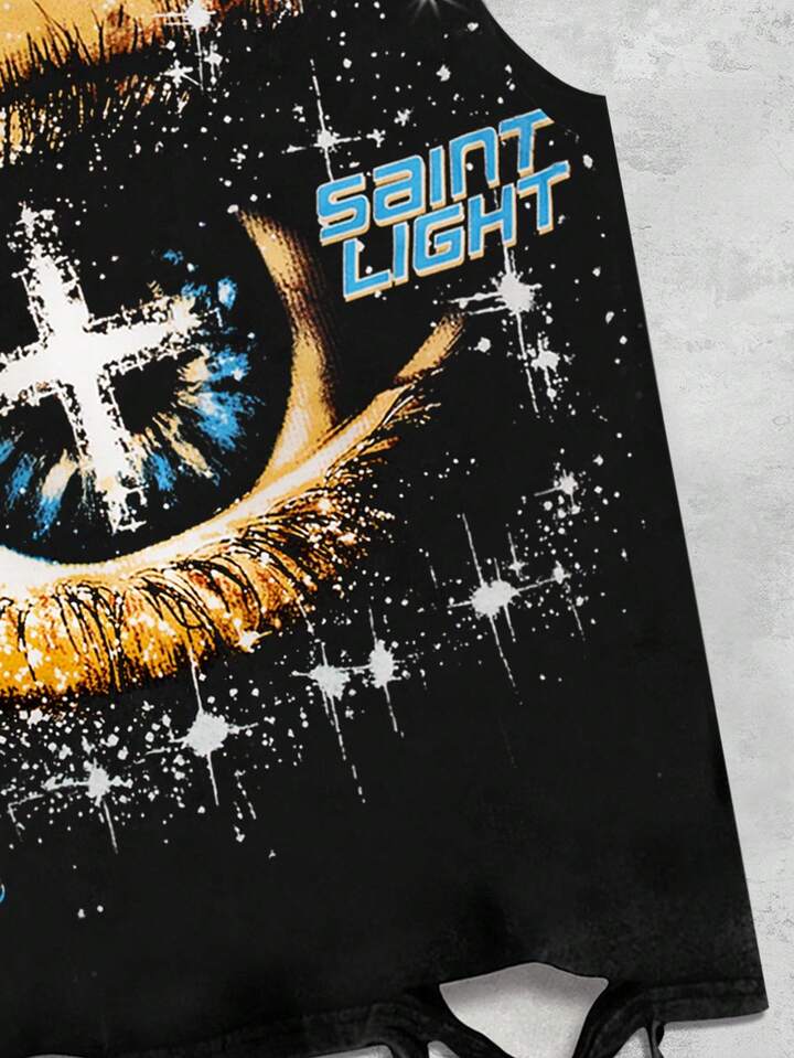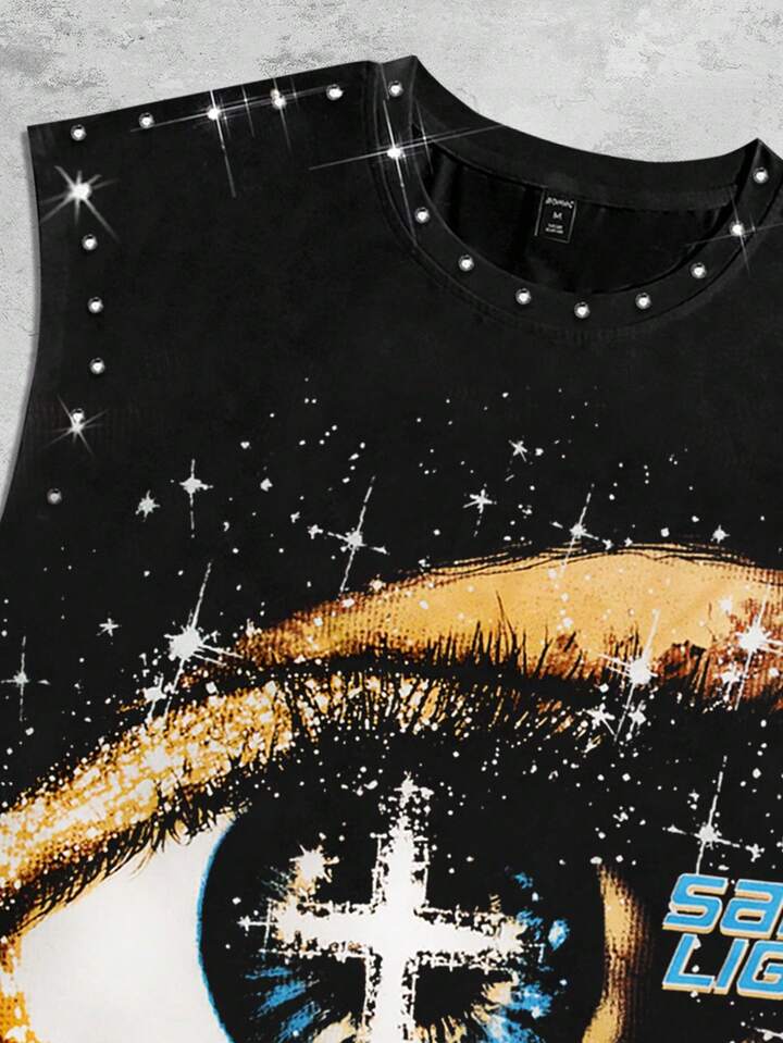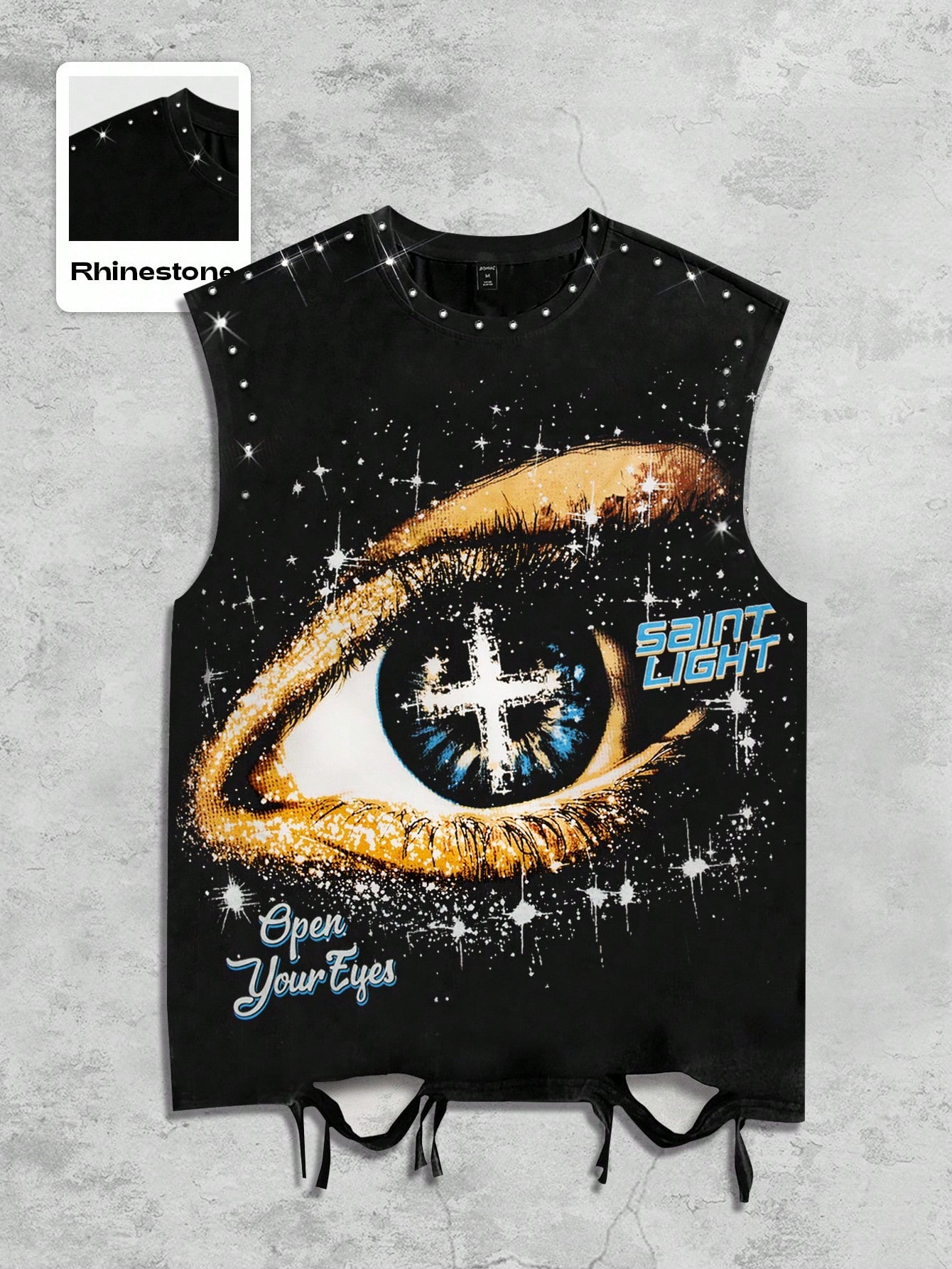 Grunge Punk Débardeur à col rond style punk de rue avec imprimé graphique, design déchiré avec strass pour hommes, été