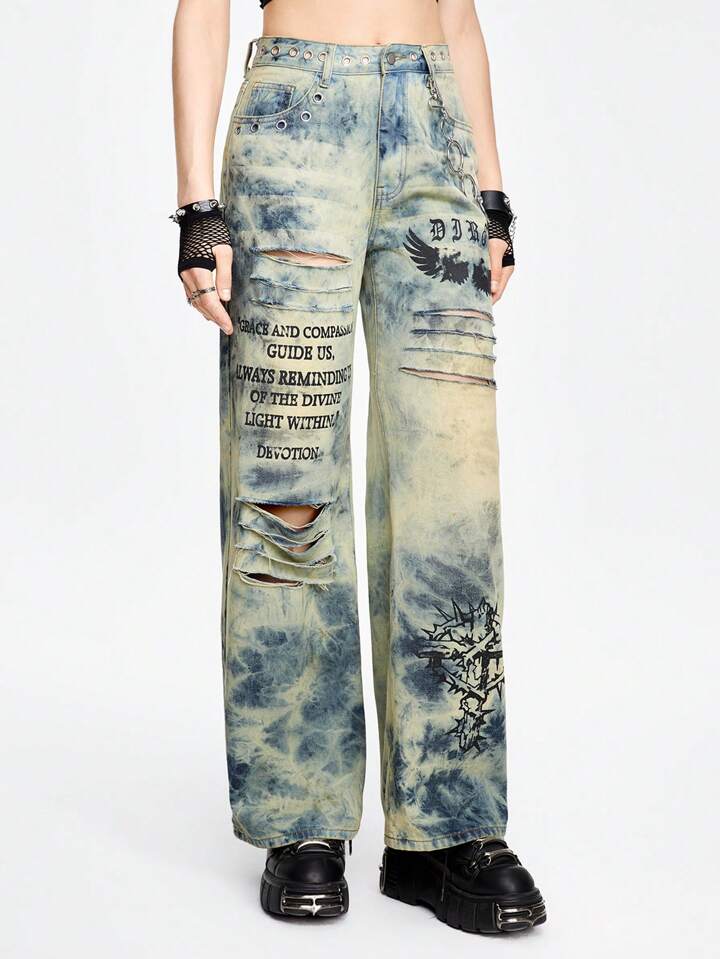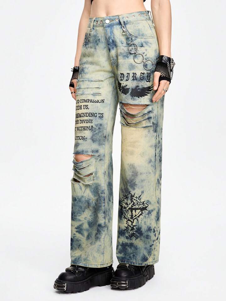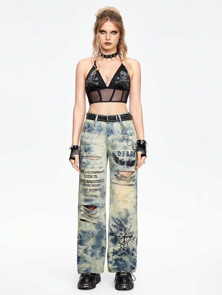 Grunge Punk Jeans pour femmes de style punk avec design de taille en métal ajouré, lavage tie-dye et imprimé lettres