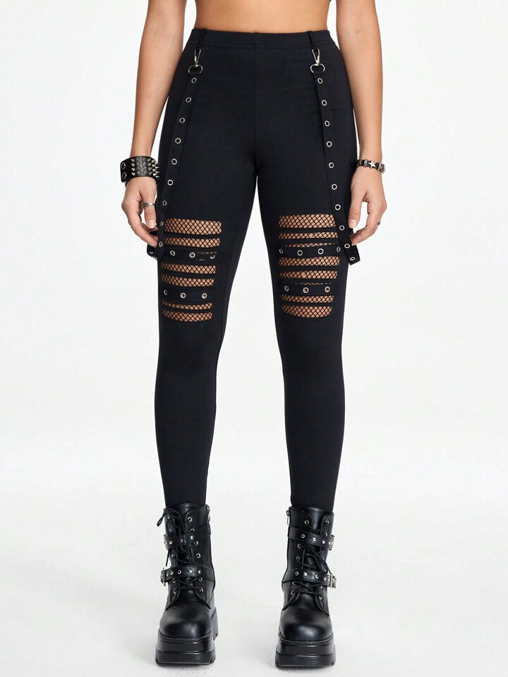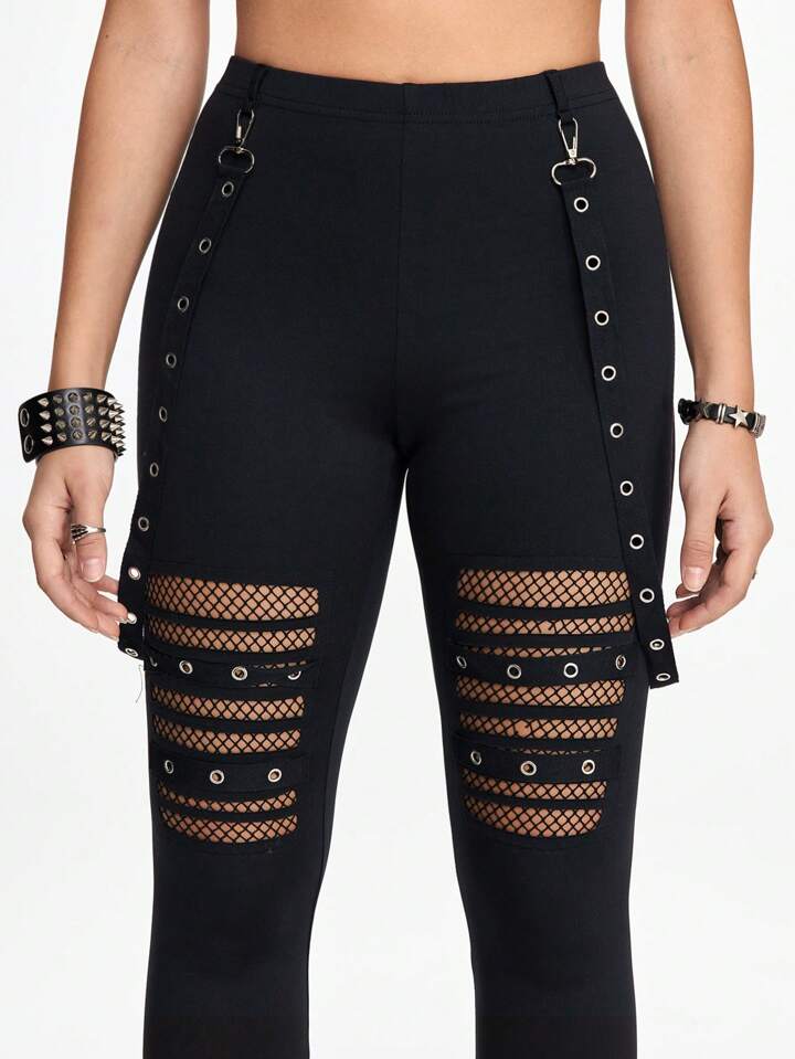 Grunge Punk Leggings moulants pour femmes avec boucle métallique à motif ajouré de style punk, taille amovible