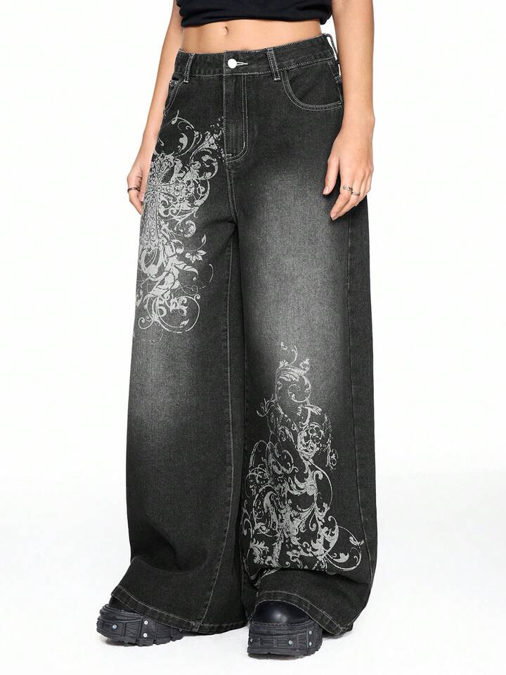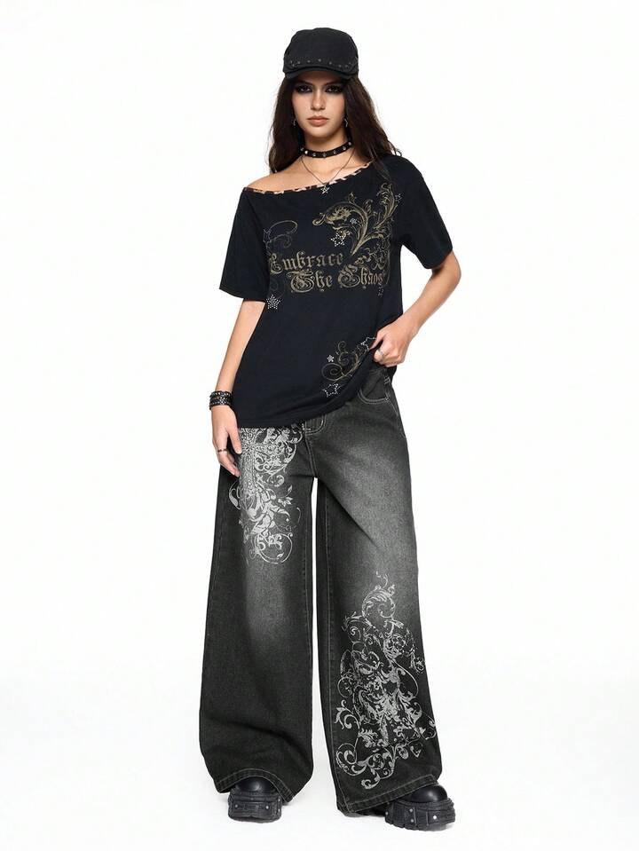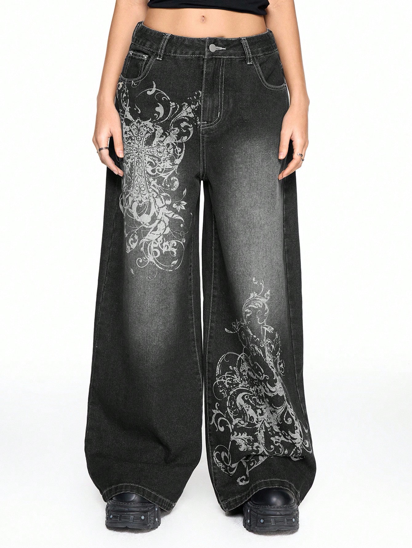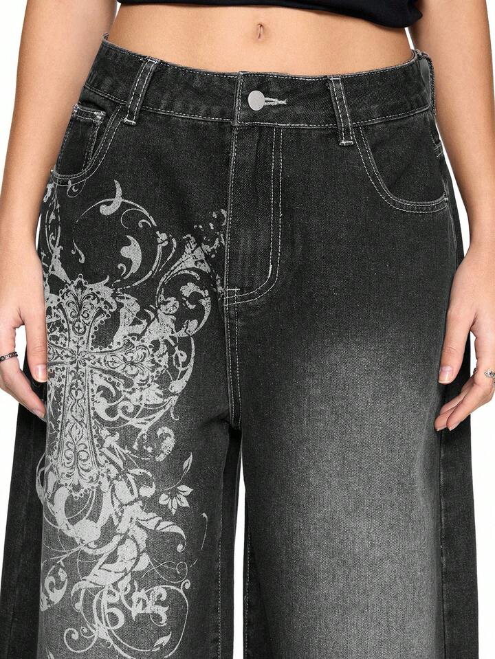 Grunge Punk Jeans femme relaxed fit, style grunge, effet vintage usé, avec imprimé croix et vignes surdimensionné