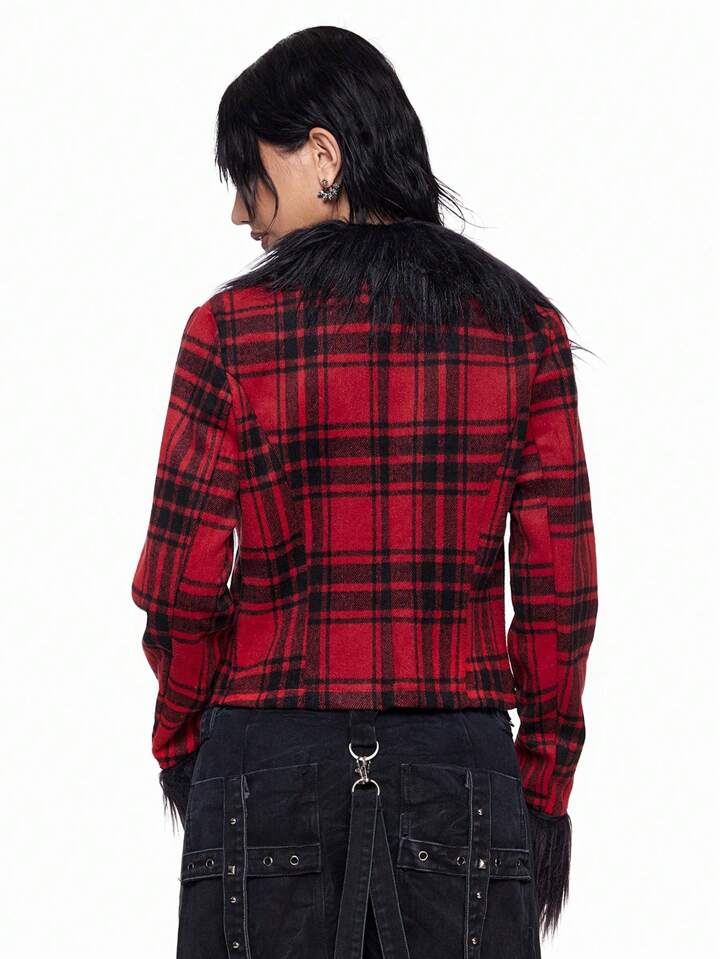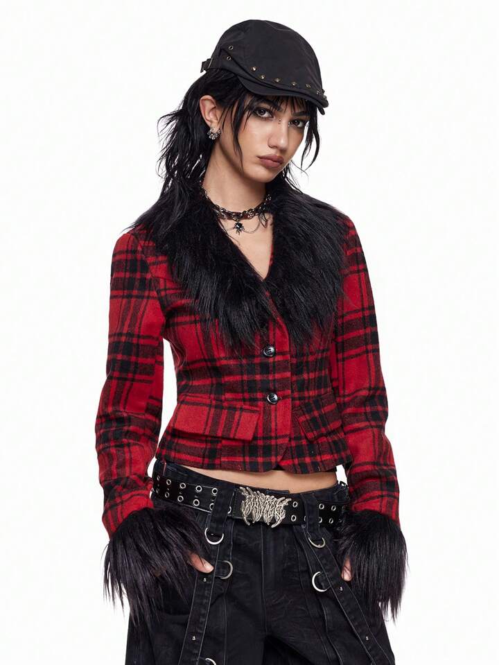 Grunge Punk Veste-cardigan à col fourrure en color-block rétro, style punk rock, coupe slim et crop