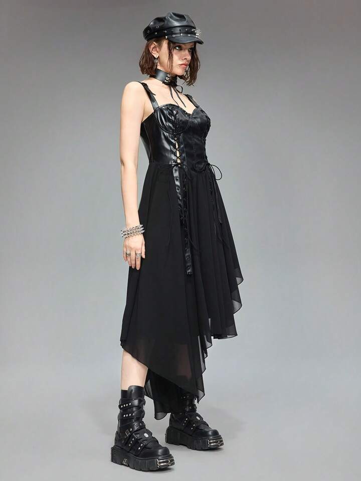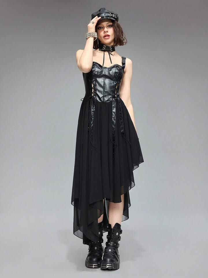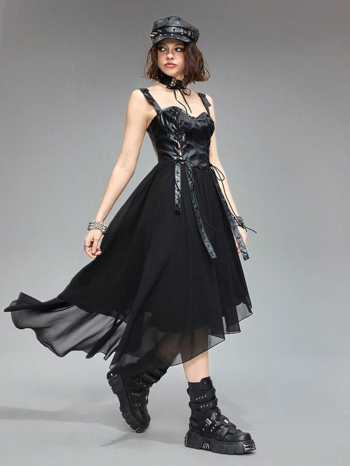 Grunge Punk Robe camisole pour femmes, en maille transparente, avec fente sexy, lanières en PU noir, laçage et nœud papillon dans le dos