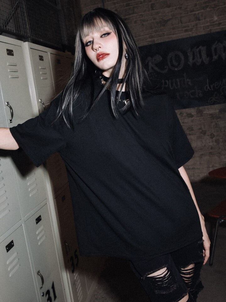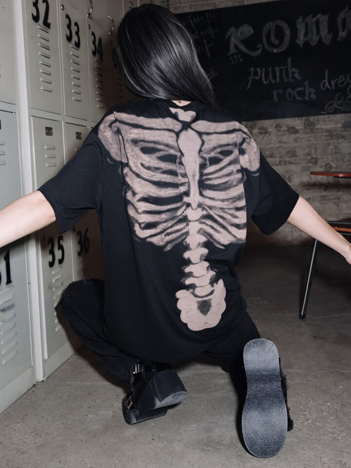 Grunge Punk T-shirt à épaules tombantes avec graphique de squelette, usage scolaire, unisexe
