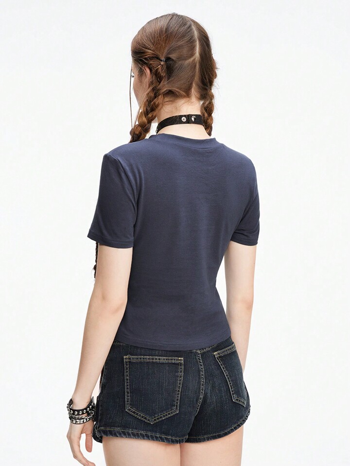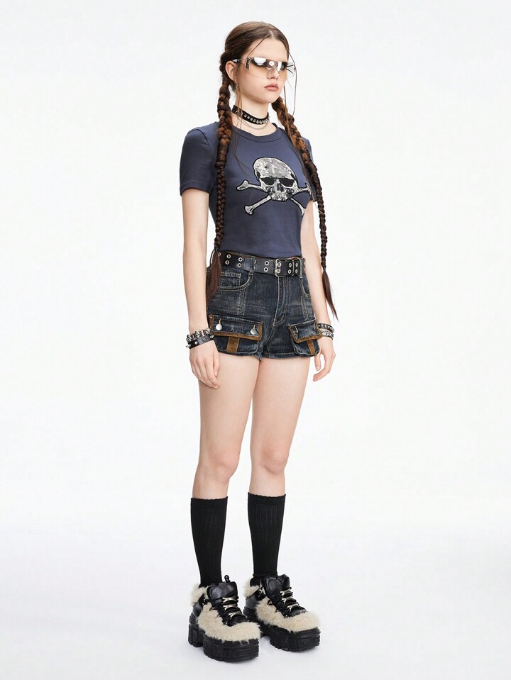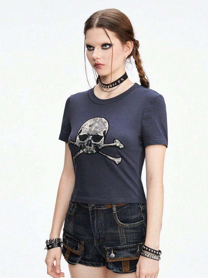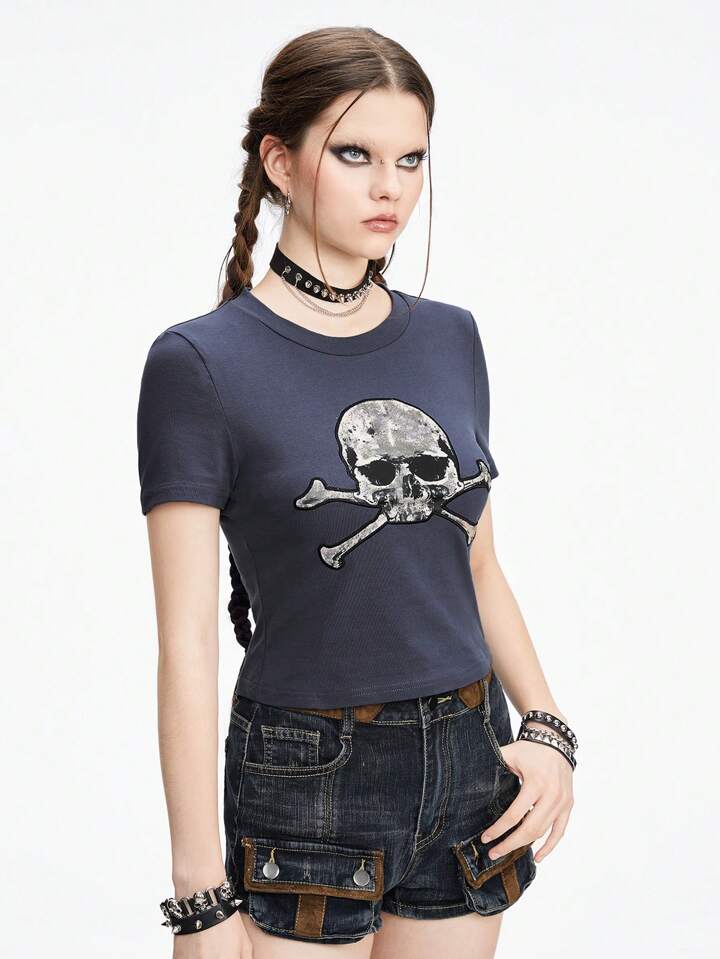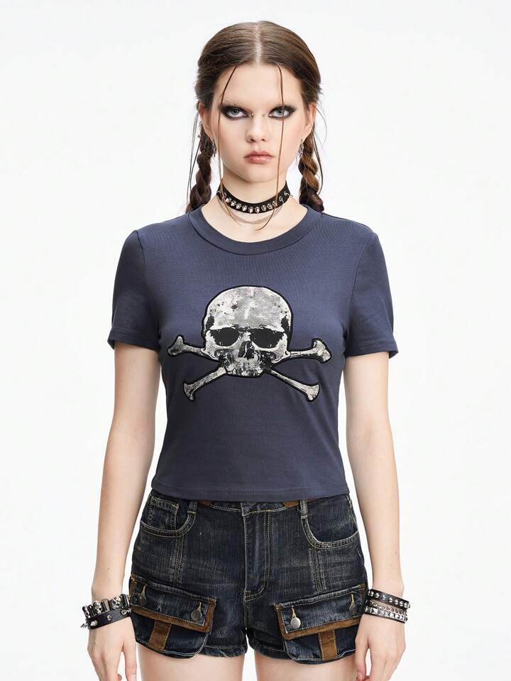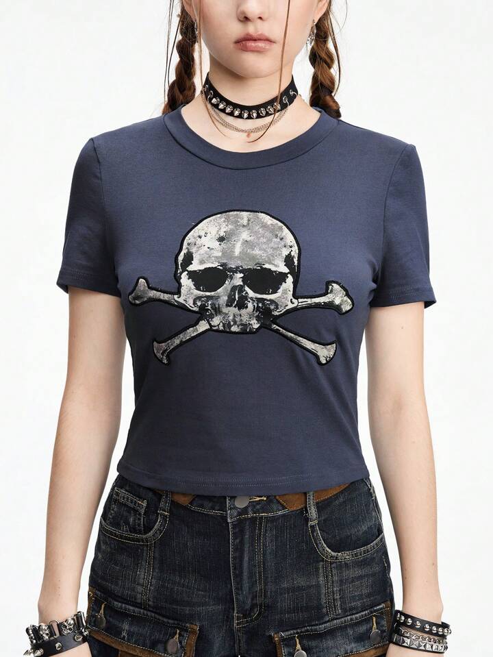 Grunge Punk T-shirt de femme moulant avec motif squelette, style punk sombre.