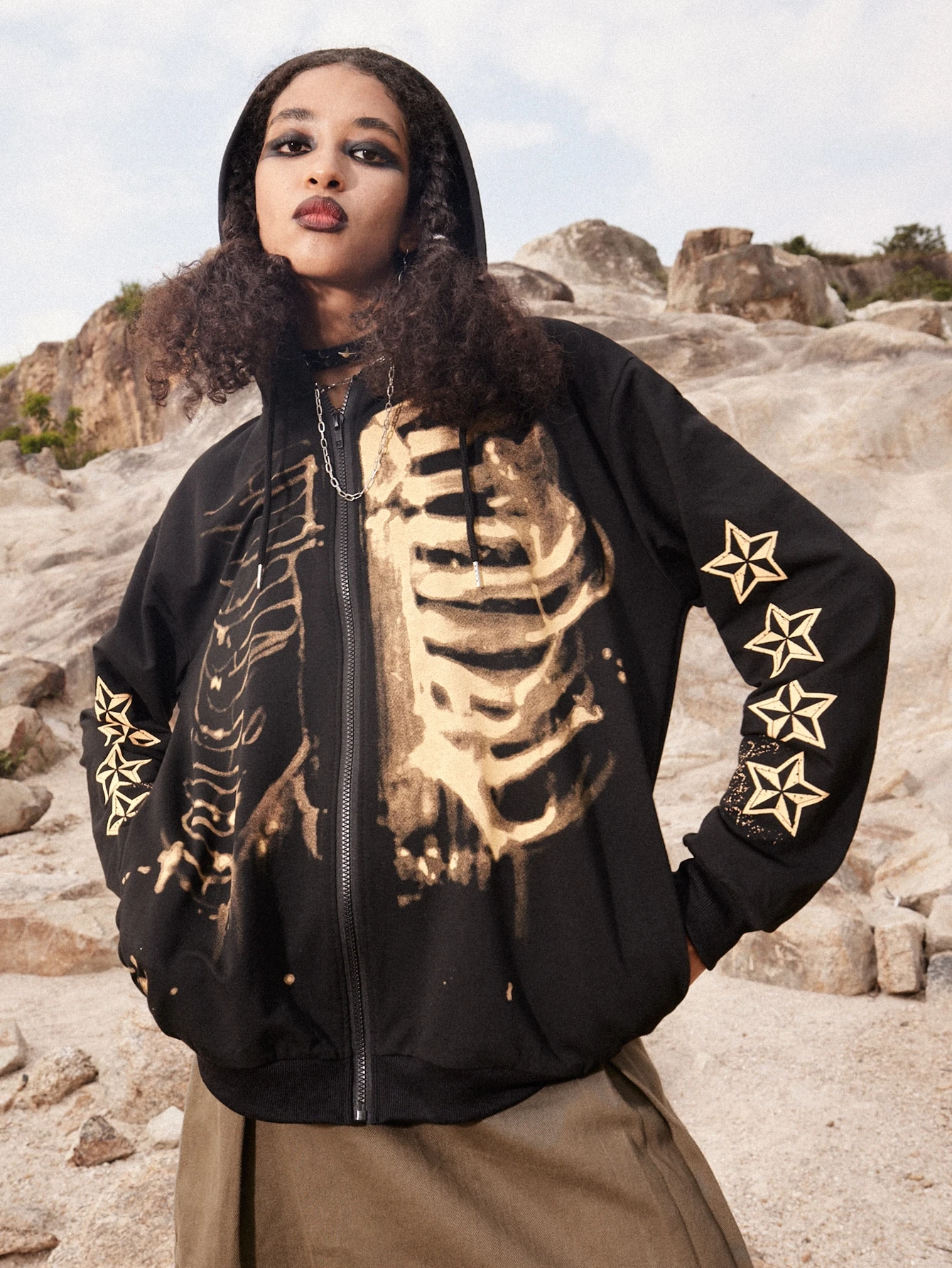 Grunge Punk Sweat-shirt à capuche zippé à imprimé squelette