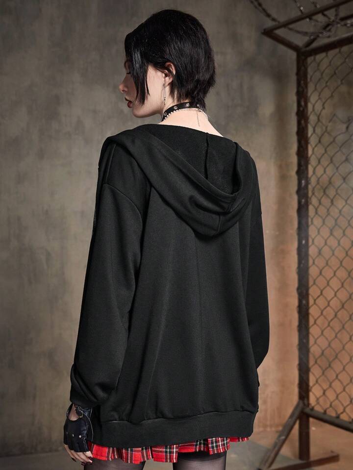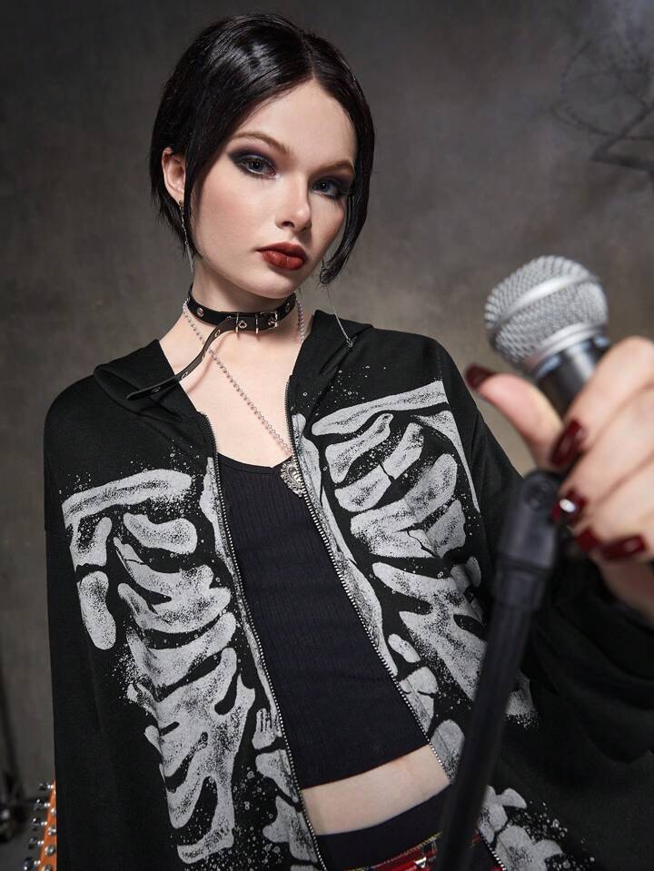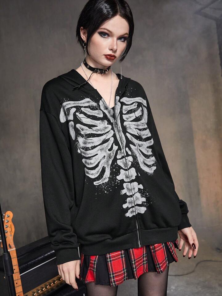 Grunge Punk Sweat-Shirt À Capuche Zippé Imprimé Squelette