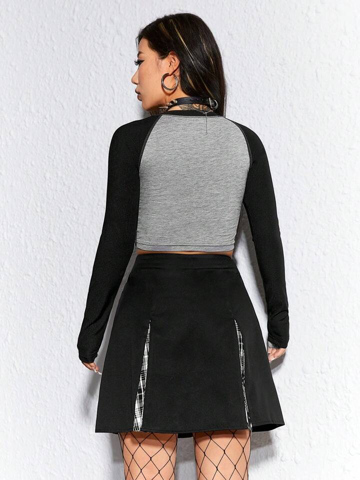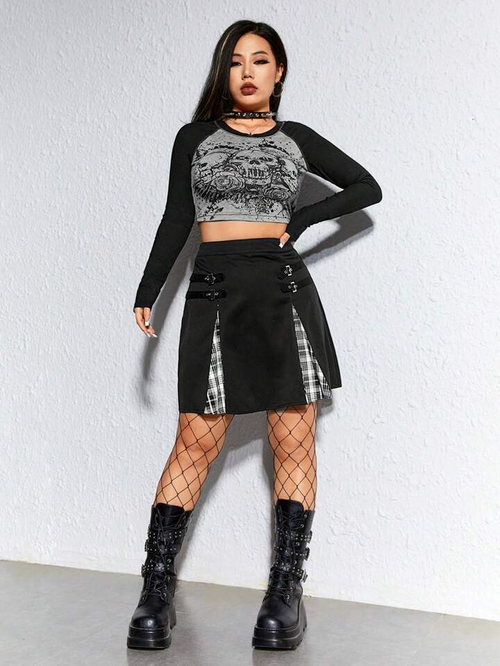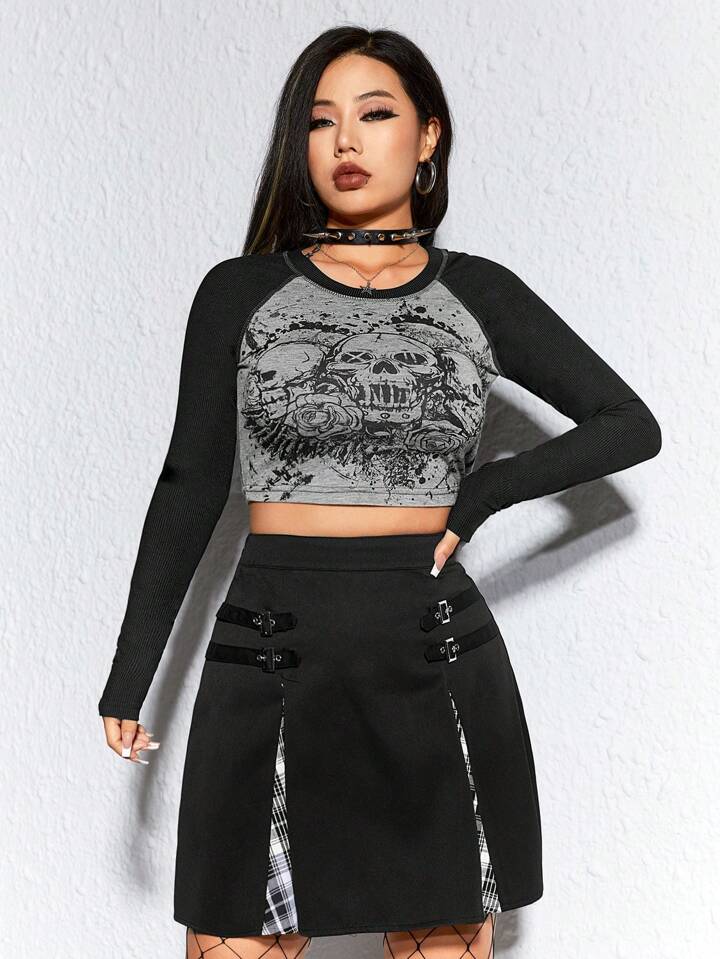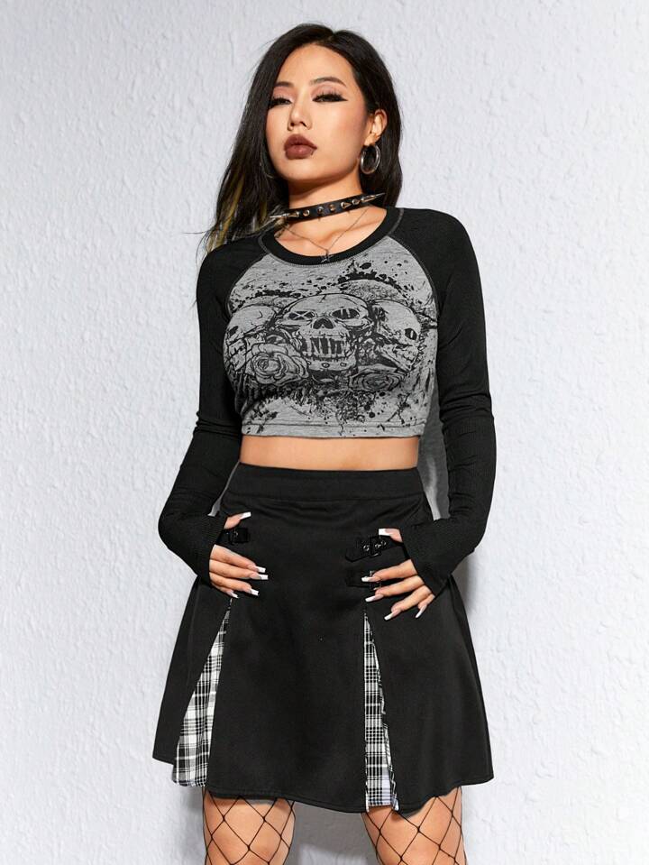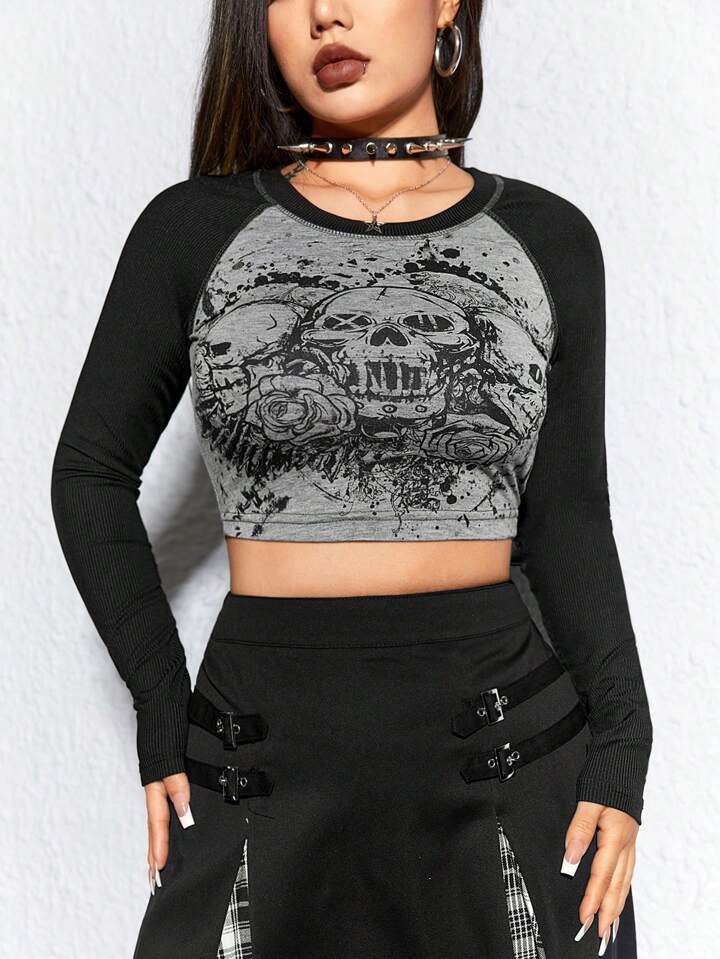 Grunge Punk T-shirt à motif tête de mort et floral à manches raglan