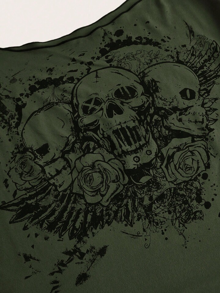 Grunge Punk Tee-shirt court à encolure bateau avec imprimé crâne et floral, école