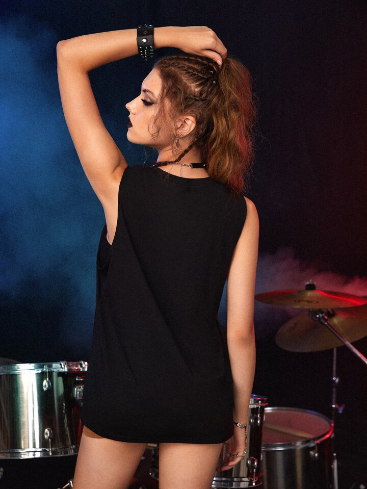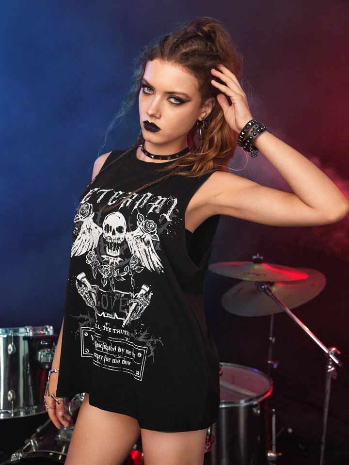 Grunge Punk Top sans manches à motif floral et slogan et tête de mort