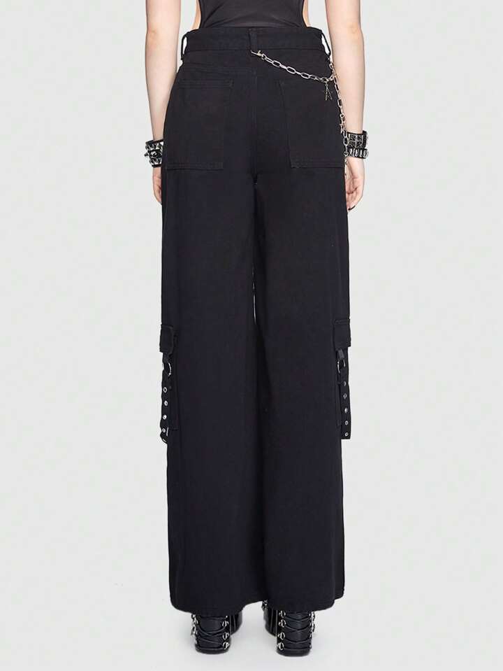 Grunge Punk Jean Cargo Unicolore Poche À Rabat