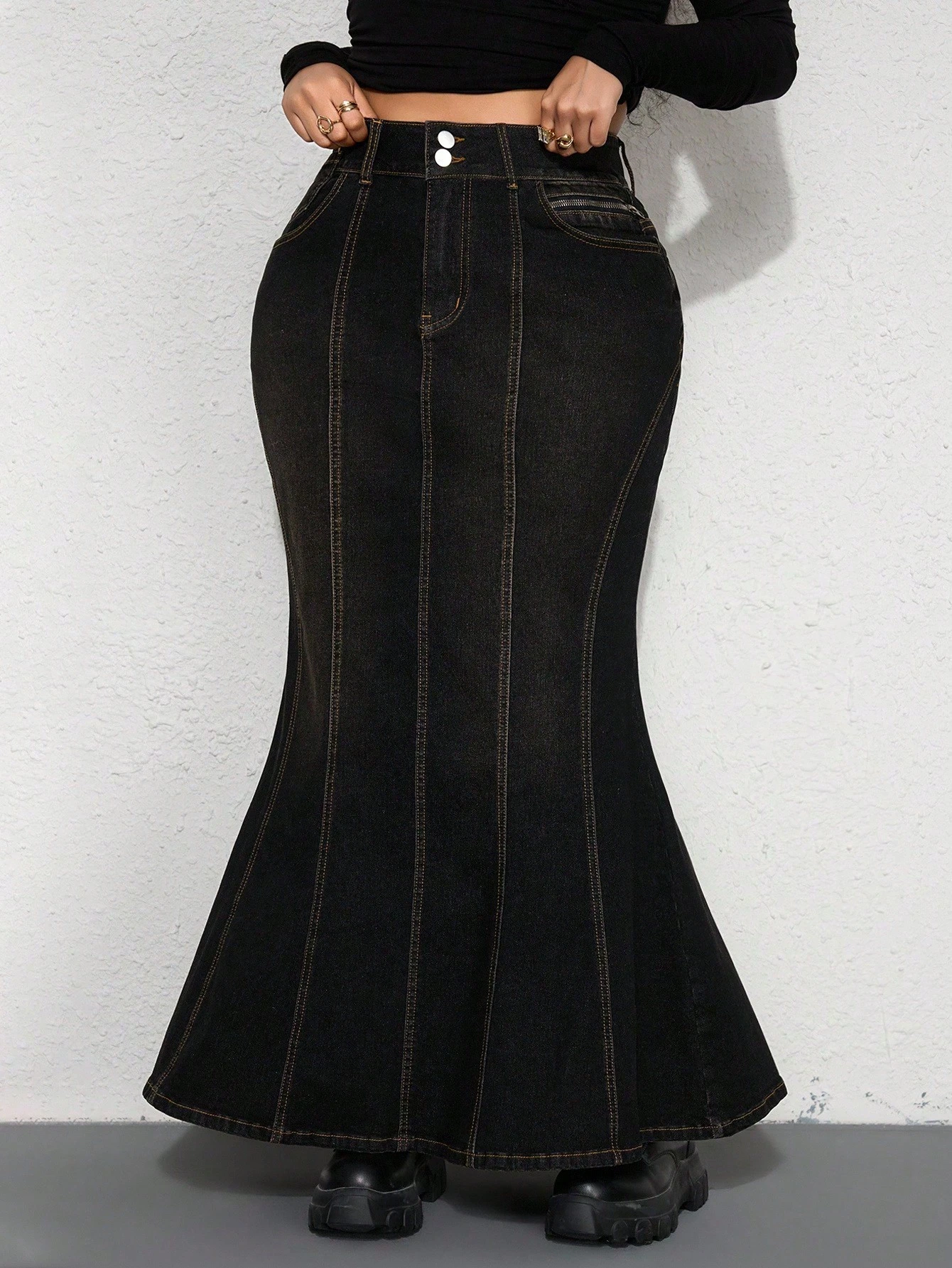 Grunge Punk Jupe en jean vintage délavé et déchiré avec rivets, coupe queue de poisson, grande taille