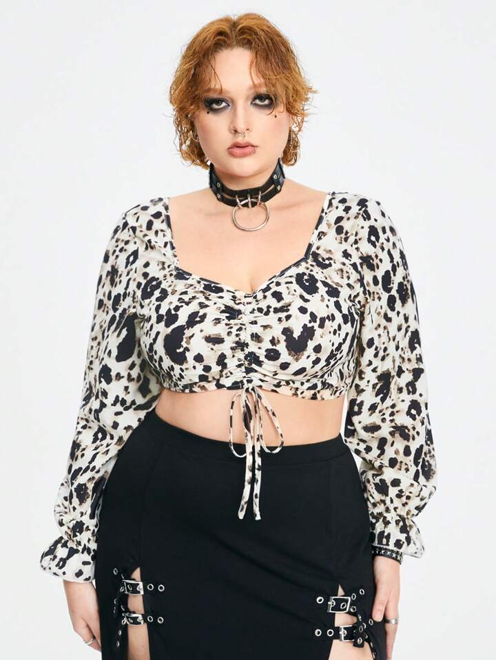 Grunge Punk Blouse à imprimé léopard style bohème pour femmes de grande taille pour le printemps, avec nœud à la taille et cordon de serrage