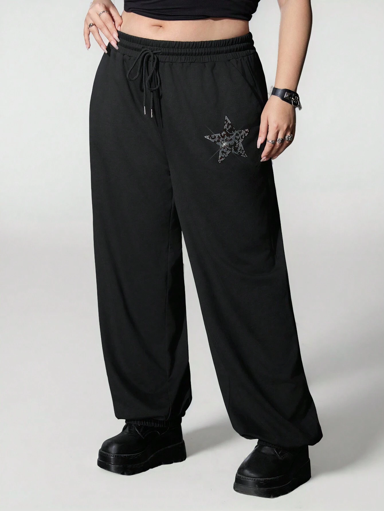 Grunge Punk Pantalon de jogging ample pour femmes avec taille à cordon, imprimé grunge punk étoile et léopard avec strass