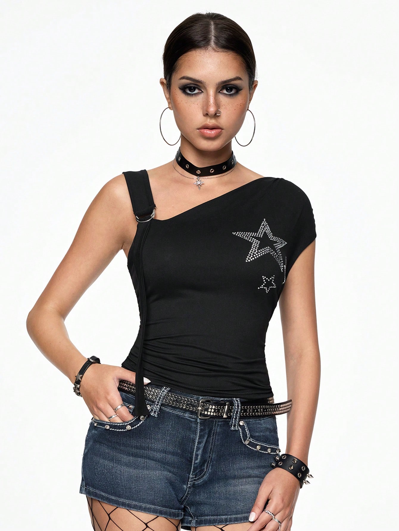 Grunge Punk Top ajusté avec col asymétrique orné de strass en forme d'étoile