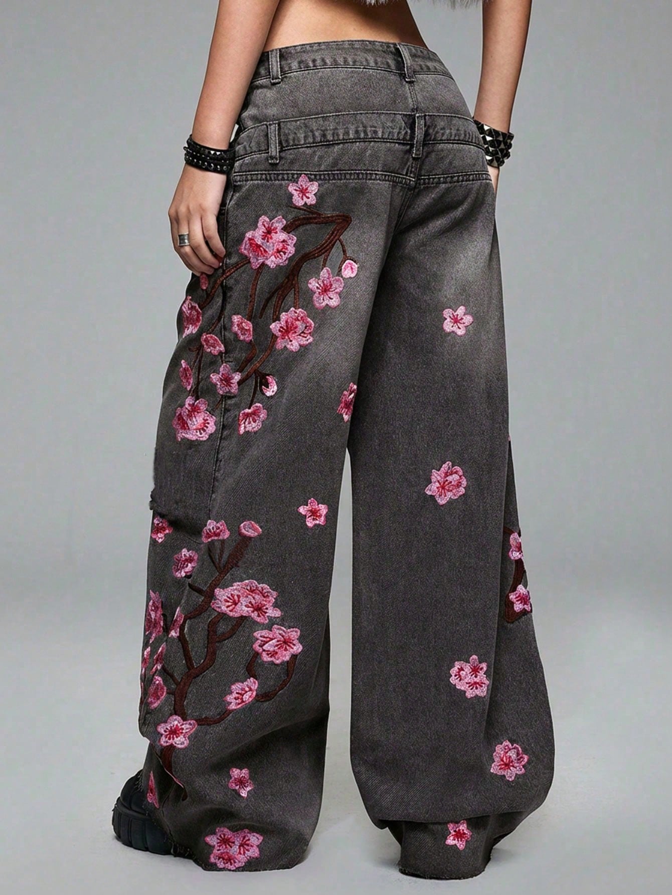 Grunge Punk Jeans ample femme avec design de double ceinture et broderie de fleurs de cerisier chic streetwear