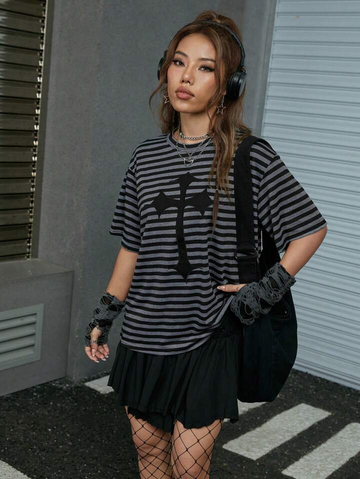 Grunge Punk T-shirt à rayures & croisé à broderie