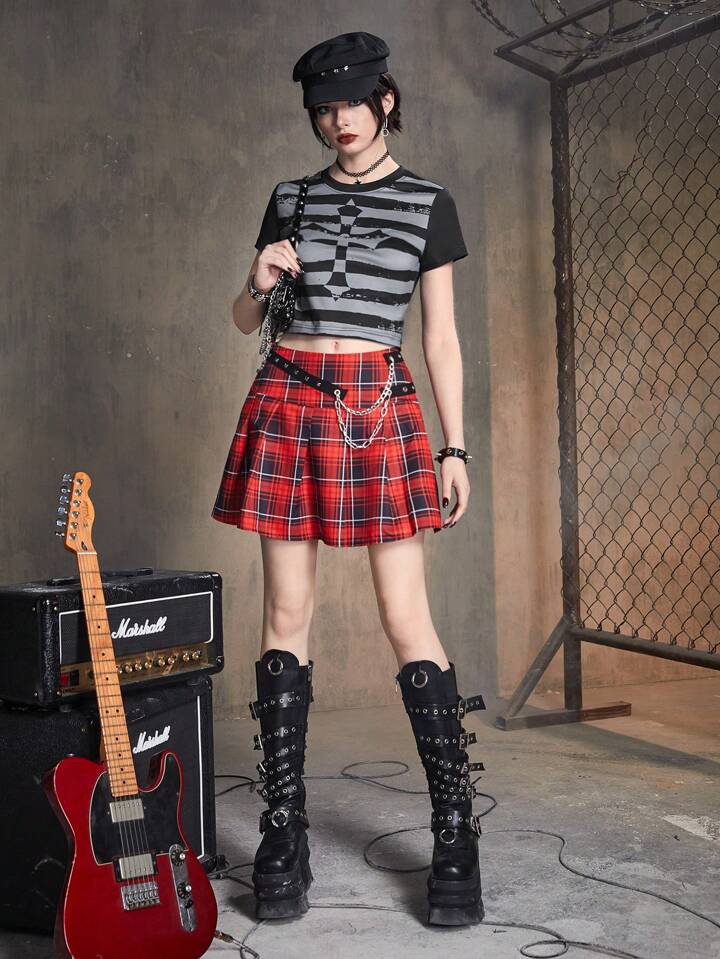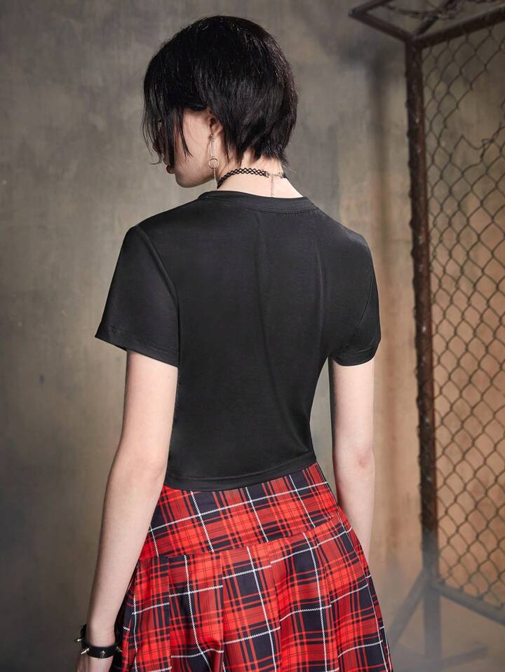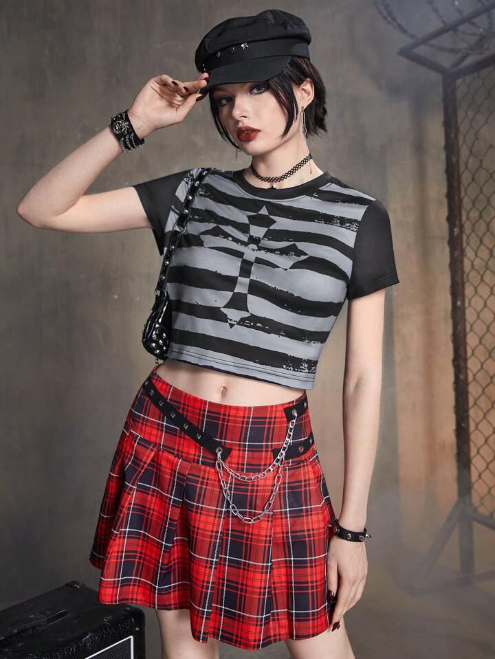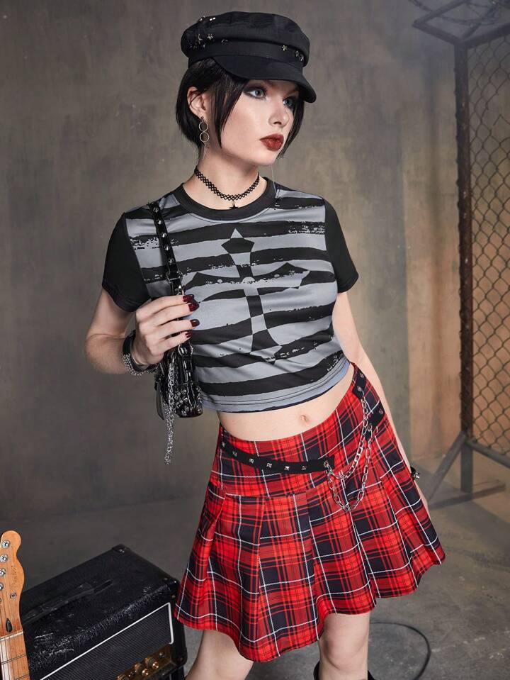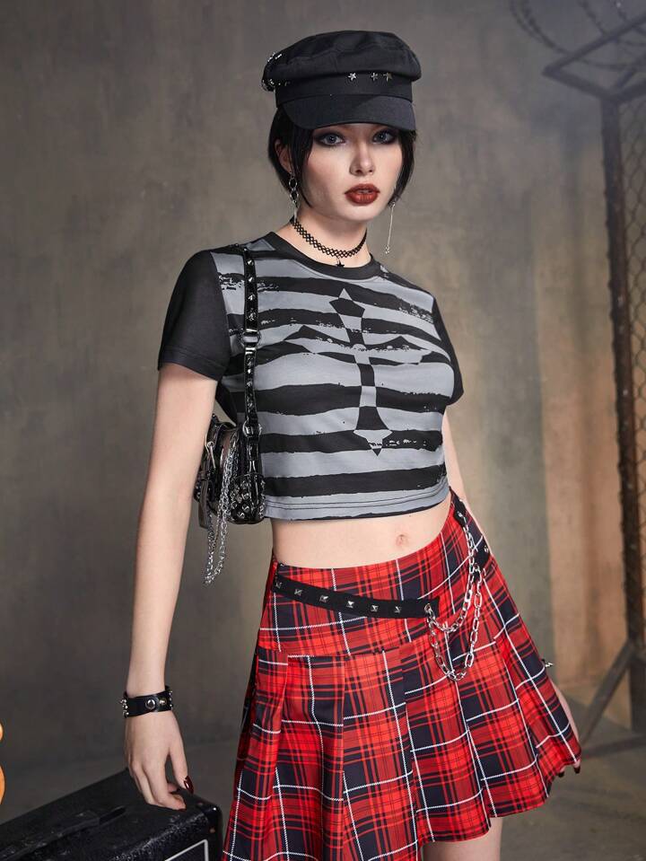 Grunge Punk T-Shirt Court À Rayures & Croisé Imprimé