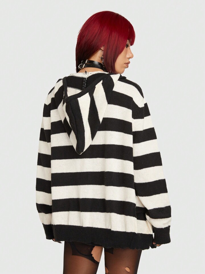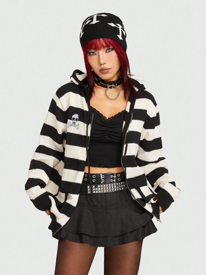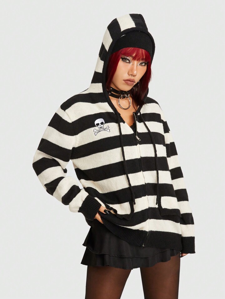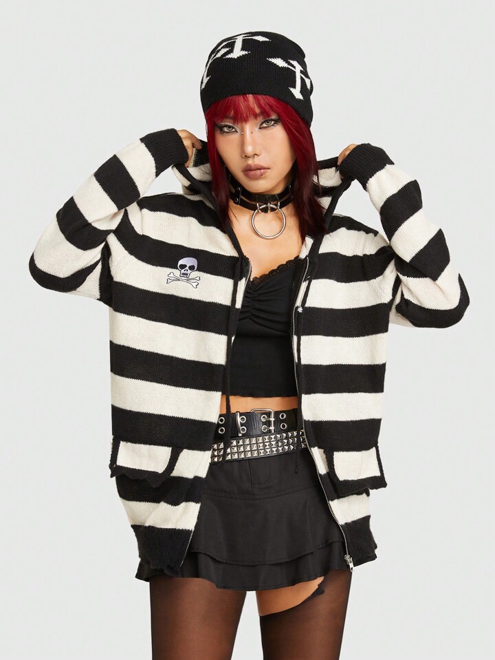 Grunge Punk Cardigan À Rayures Tête De Mort À Broderie Zippé