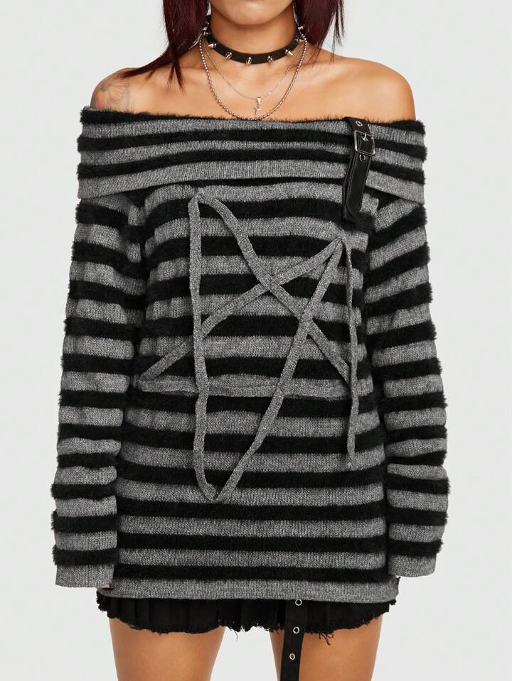 Grunge Punk Pull À Rayures Motif Étoile Col Bardot