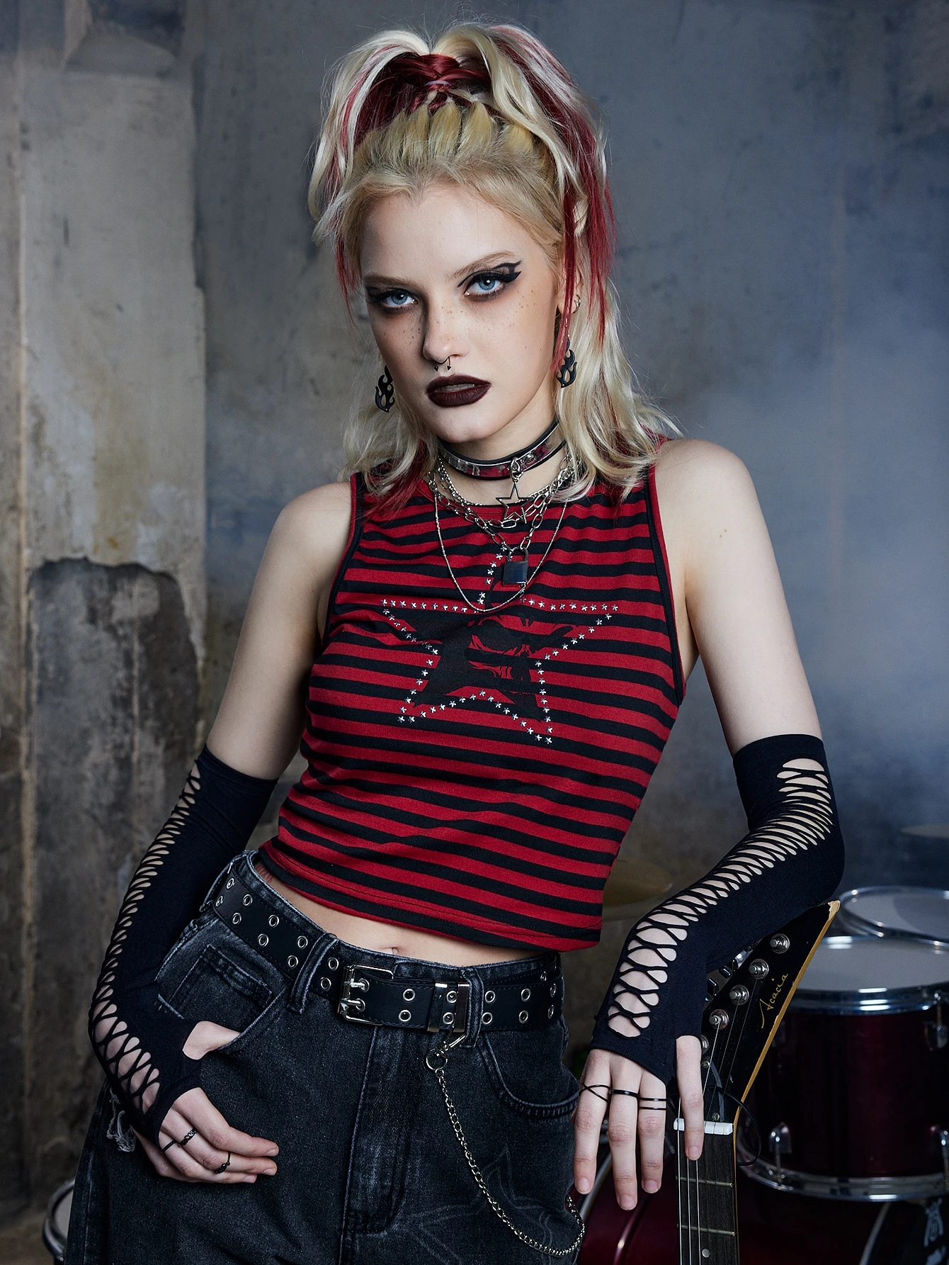 Grunge Punk Top Sans Manches À Rayures Étoile & Imprimé Tête De Mort