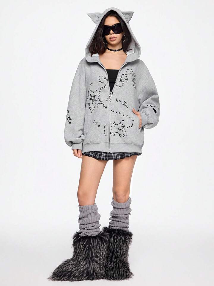 Grunge Punk sweat-shirt à capuche ample style de rue underground avec oreilles de chat brodées et émoticons, ouverture devant