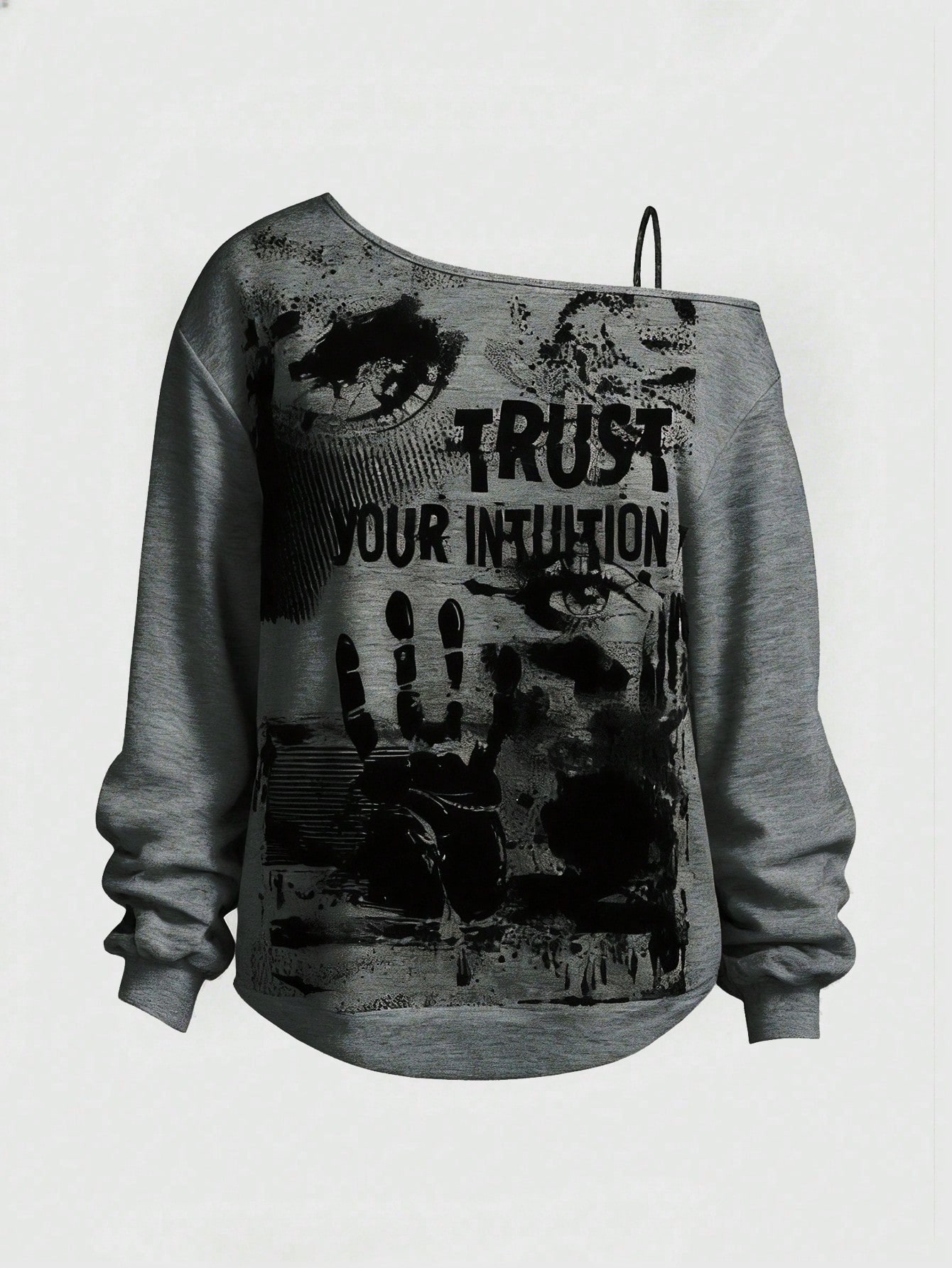 Grunge Punk Sweat-shirt à épaules obliques avec slogan, yeux et paume mystérieux, style rock punk pour grande taille