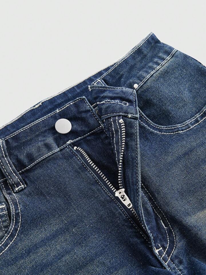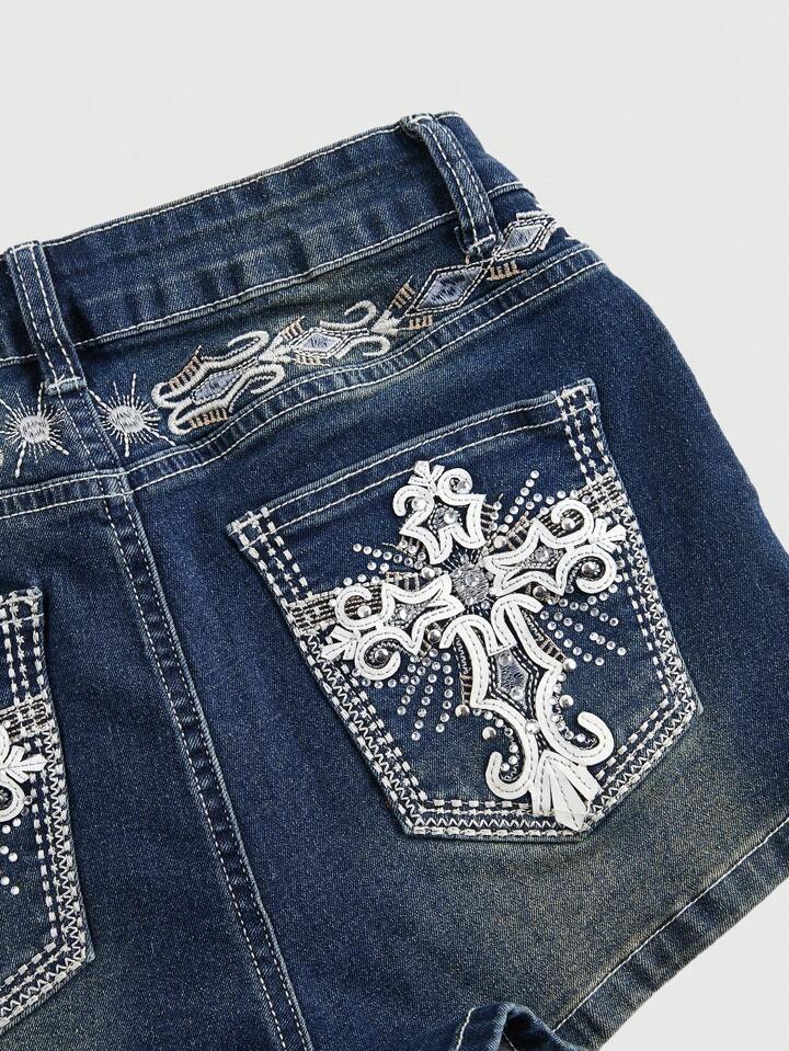 Grunge Punk Short en jean ajusté pour femmes avec broderie d'ailes de poche croisée, style "Trash Punk Y2K Vintage Millennium Sexy". Navy bleu, taille basse, jambe évasée, bouton, poche, zip. Portée décontractée au quotidien, printemps/automne