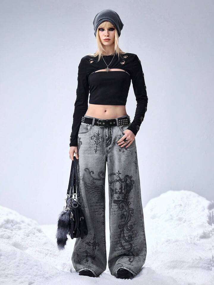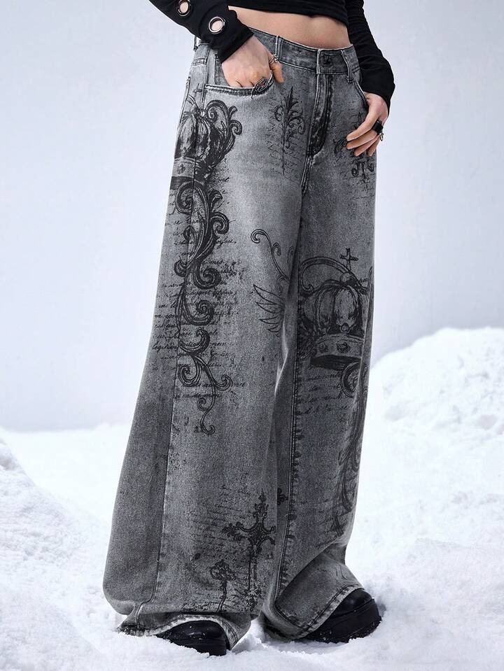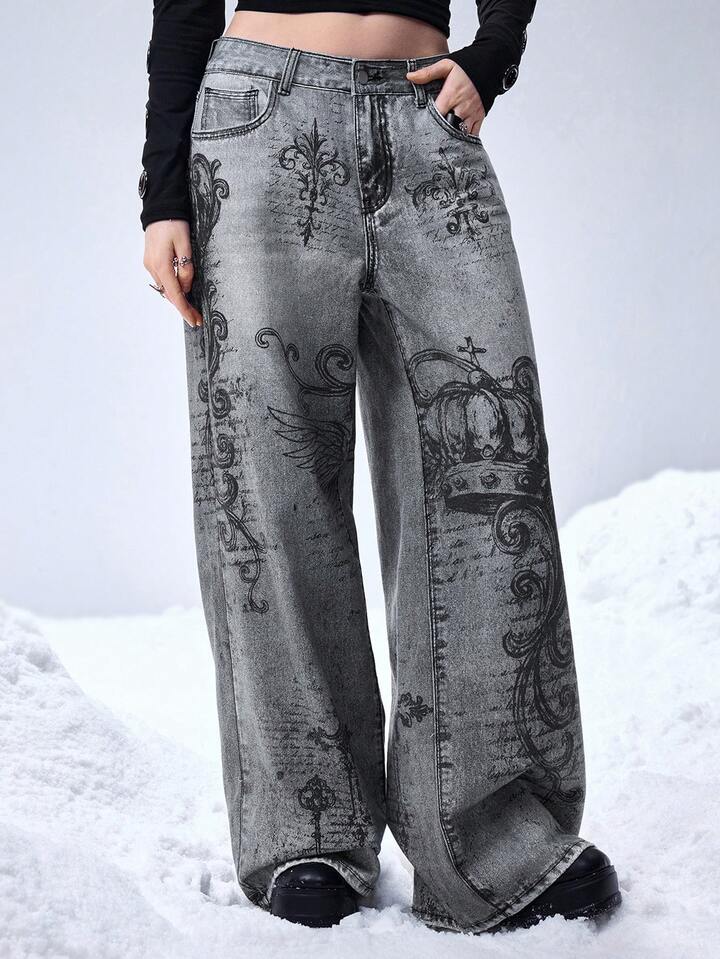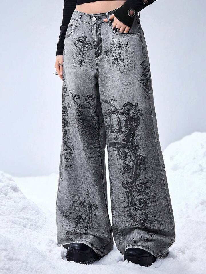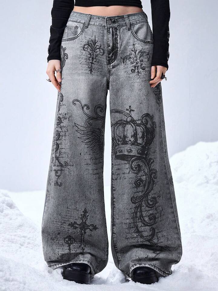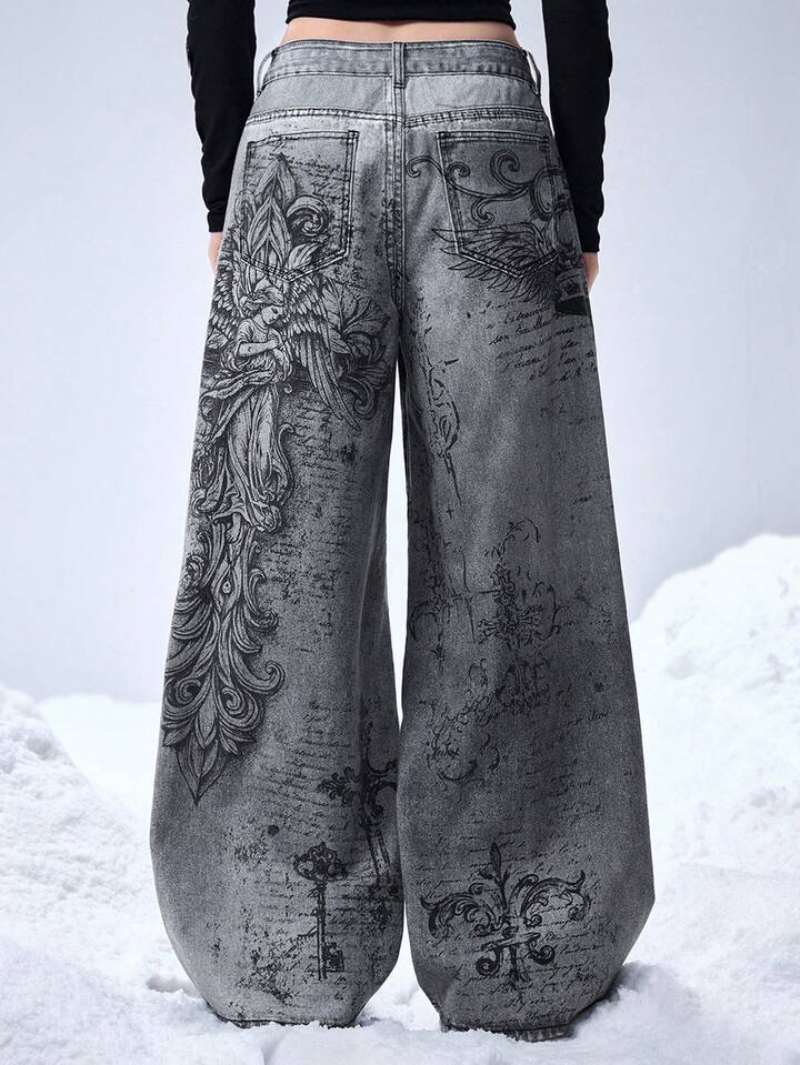Grunge Punk Jeans amples à jambes larges unisexes avec imprimé vintage d'ange de rue et de couronne de vigne