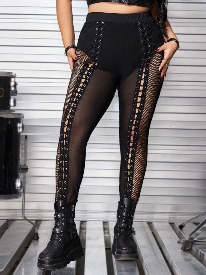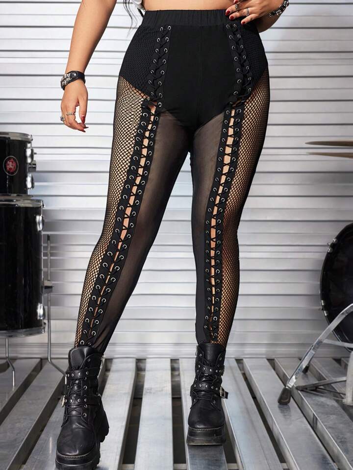 Grunge Punk Leggings en maille métallique ajourée avec épissure pour la Saint-Valentin, style carnaval punk, pour femmes grandes tailles. Collants skinny stretch